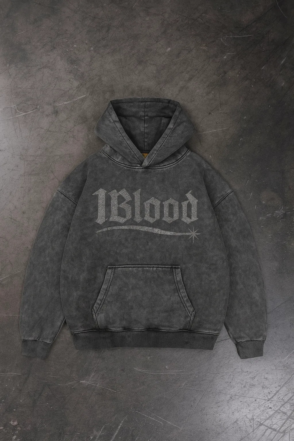 1Blood Yıkamalı Beyaz Taş Baskılı Oversize Unisex Kapüşonlu Sweatshirt