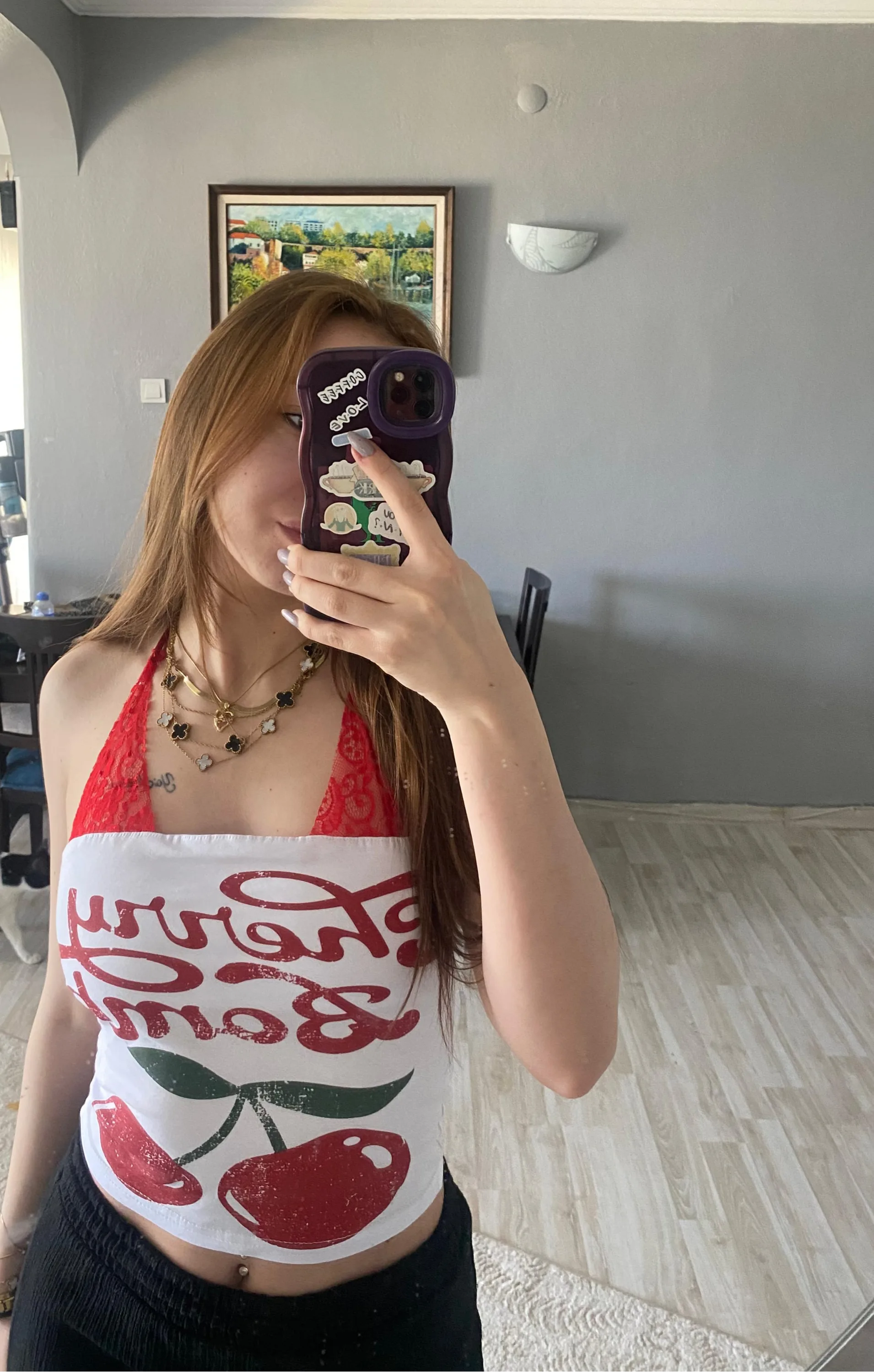 Beyaz Cherry Bomb Dantelli Ek Askılı Crop