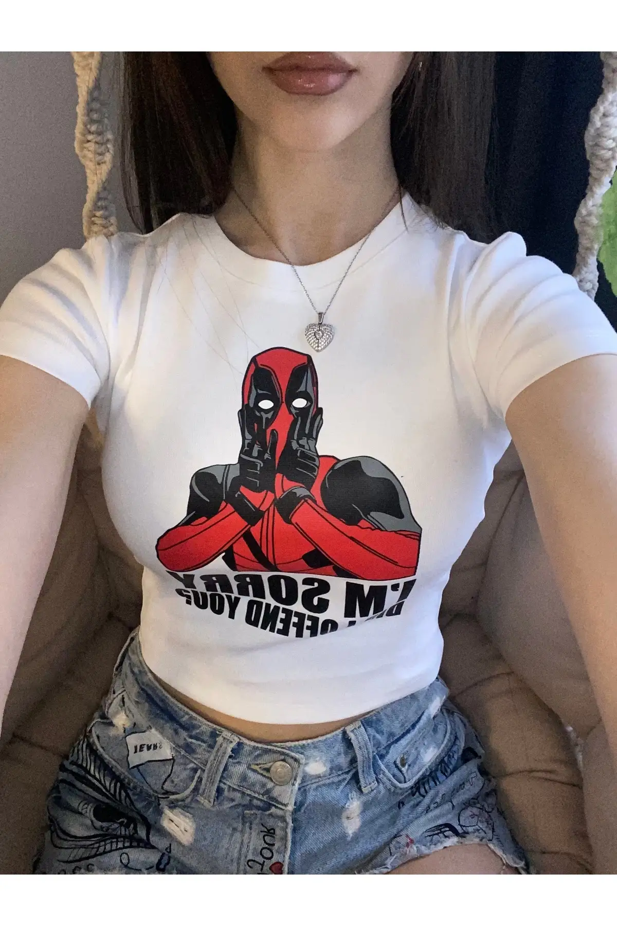 Beyaz Deadpool Karakter ve Yazı Baskılı Model Crop Body