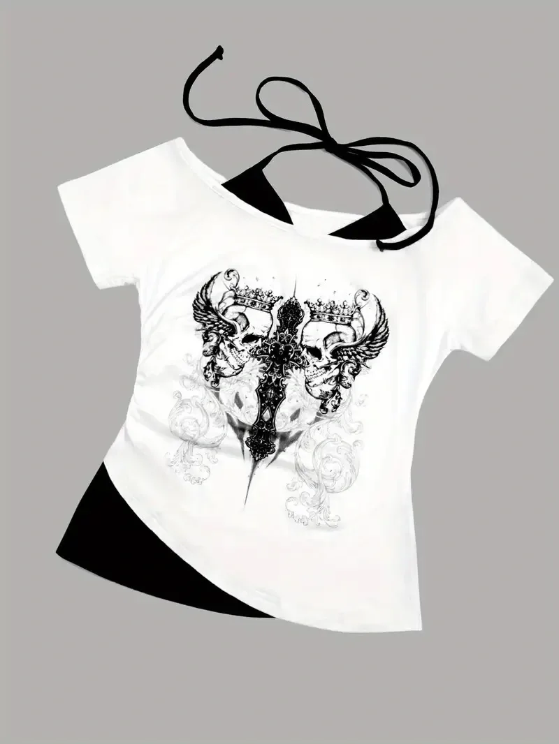 Beyaz Gothic Angel Yaka Ek Askılı Kısa Kollu Full Body Crop