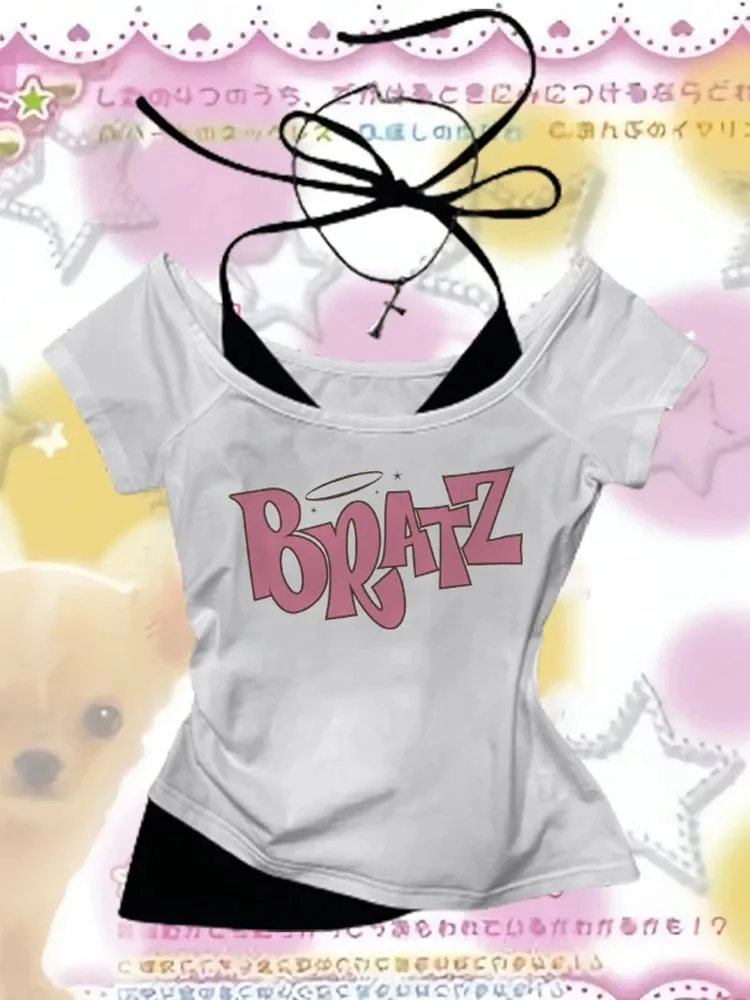 Beyaz Gothic Bratz Yaka Ek Askılı Kısa Kollu Full Body Crop