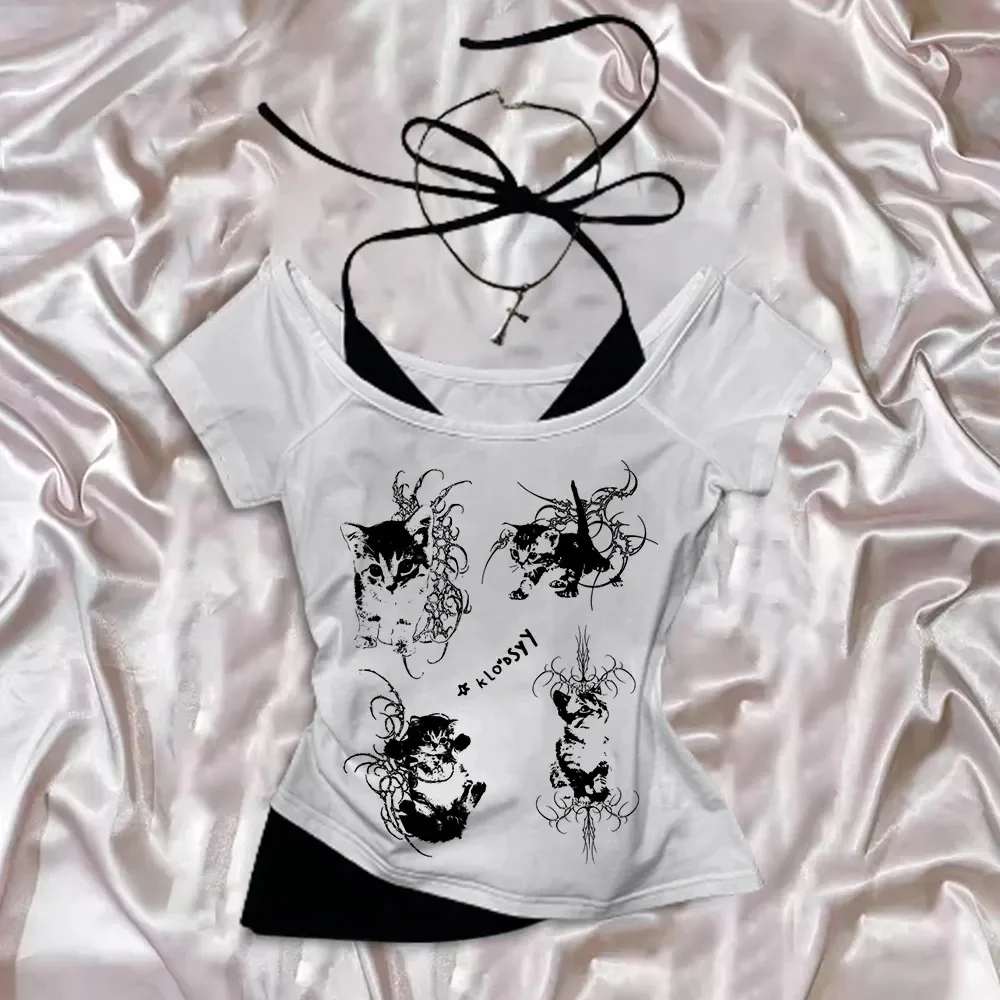 Beyaz Gothic Cat Yaka Ek Askılı Kısa Kollu Full Body Crop