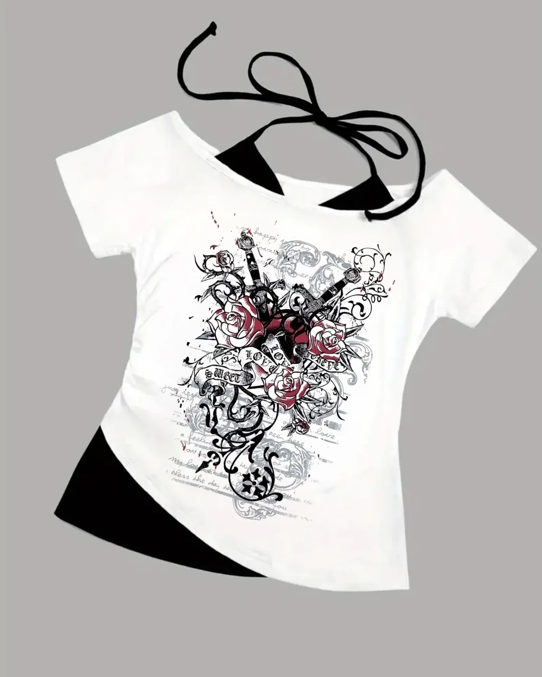 Beyaz Gothic Red Love Yaka Ek Askılı Kısa Kollu Full Body Crop
