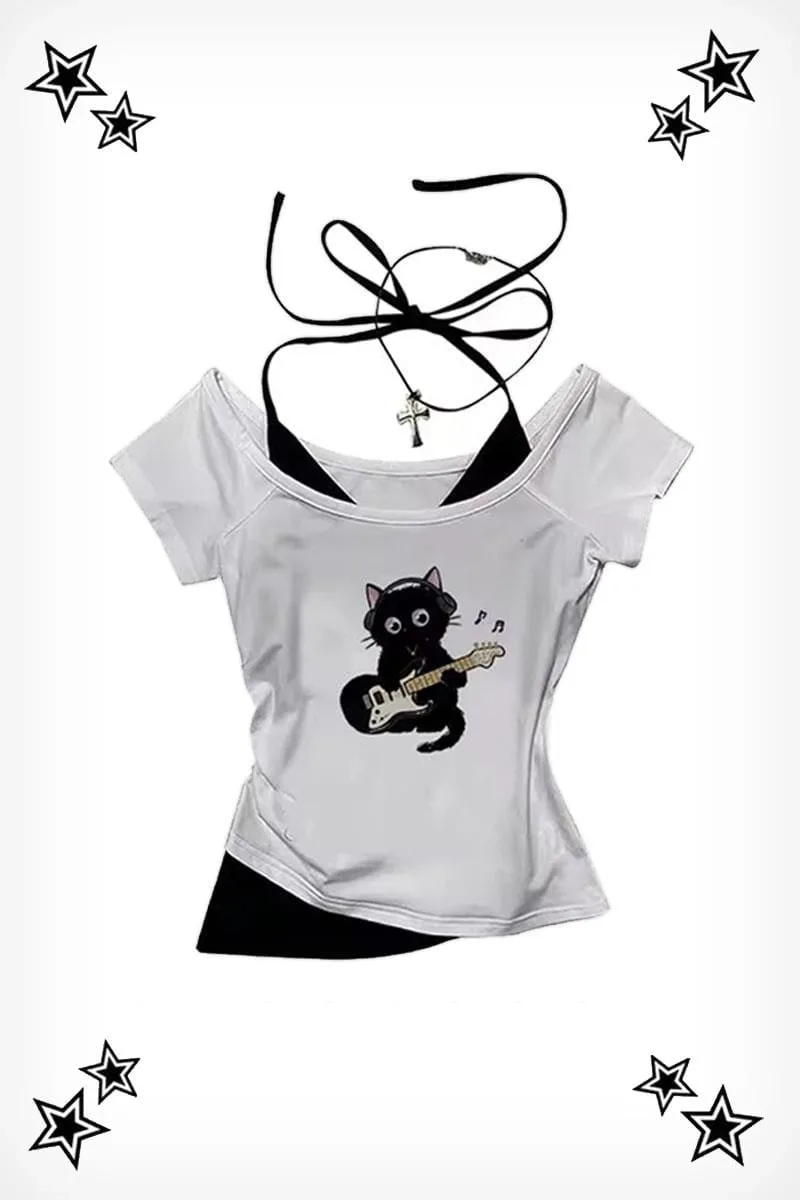 Beyaz Guitar Cat Madonna Yaka Ek Askılı Kısa Kollu Crop