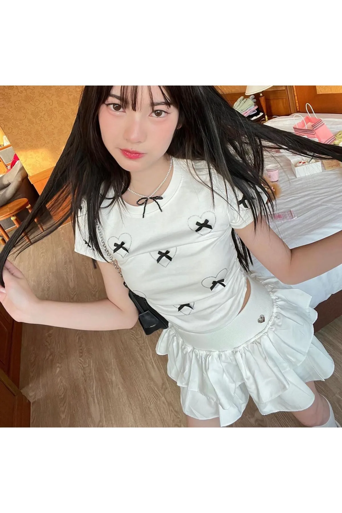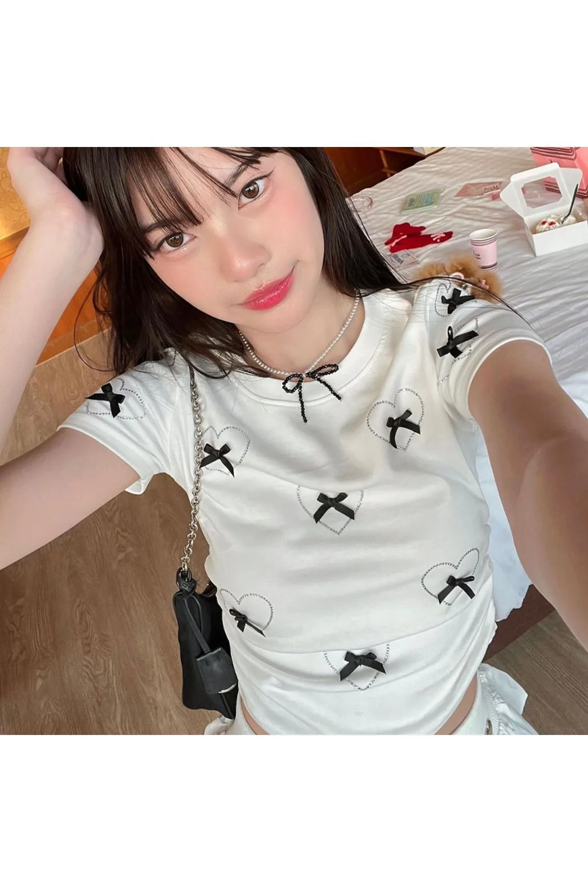 Beyaz Heart Fiyonk Collage Kısa Kollu Crop