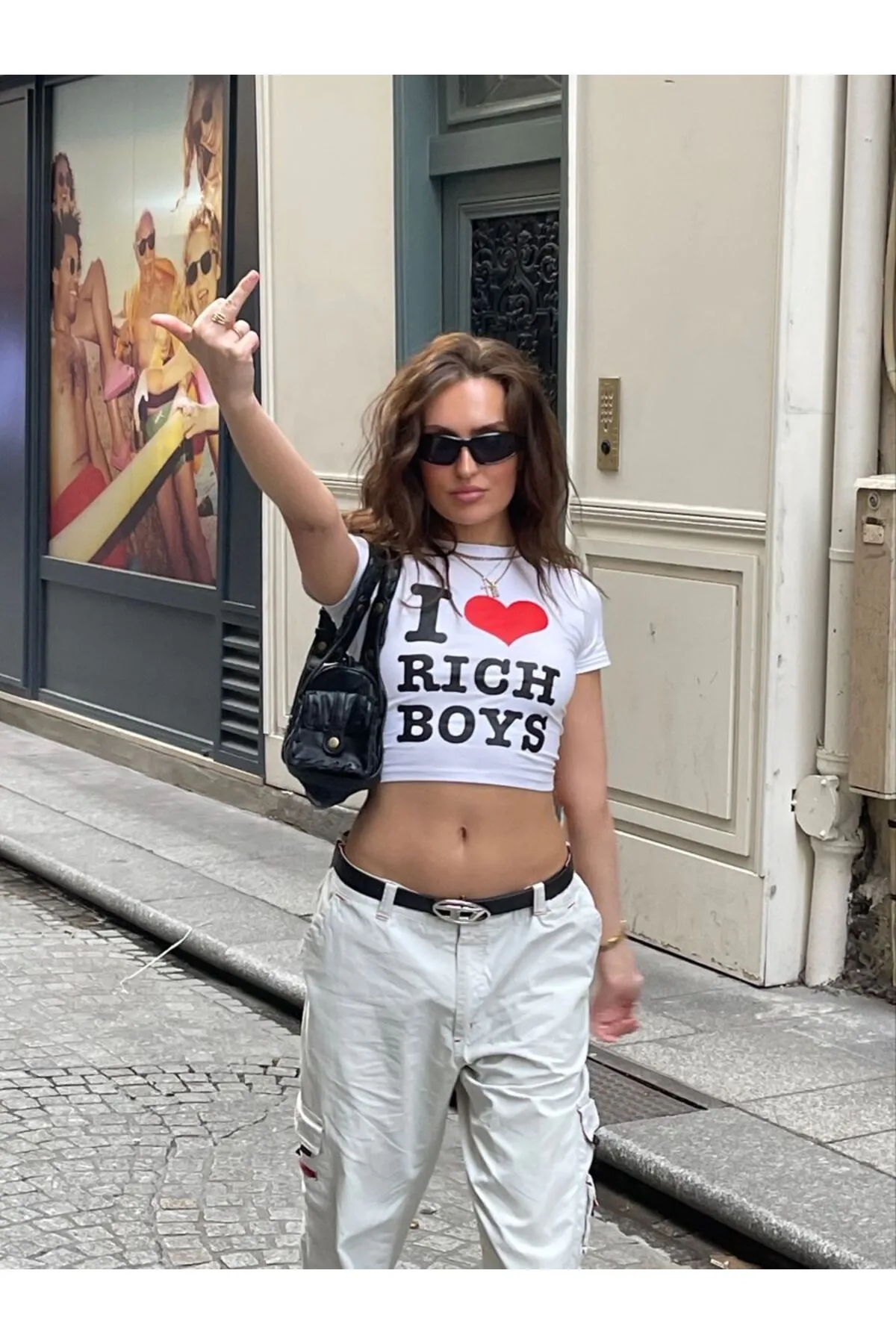 Beyaz I Love Rich Boys Siyah Yazılı Detail Bluz Body Crop Top