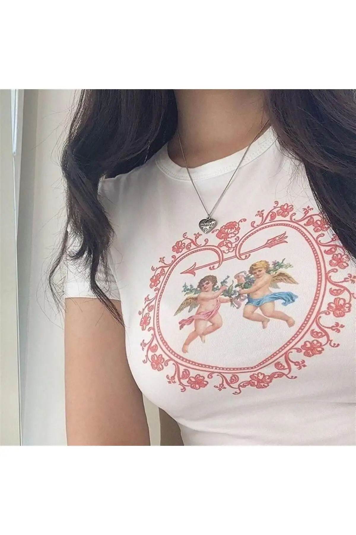 Beyaz Sword Warriror Angel Madonna Yaka Ek Askılı Kısa Kollu Full Body Crop