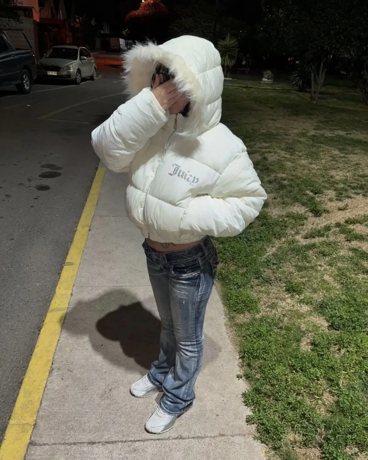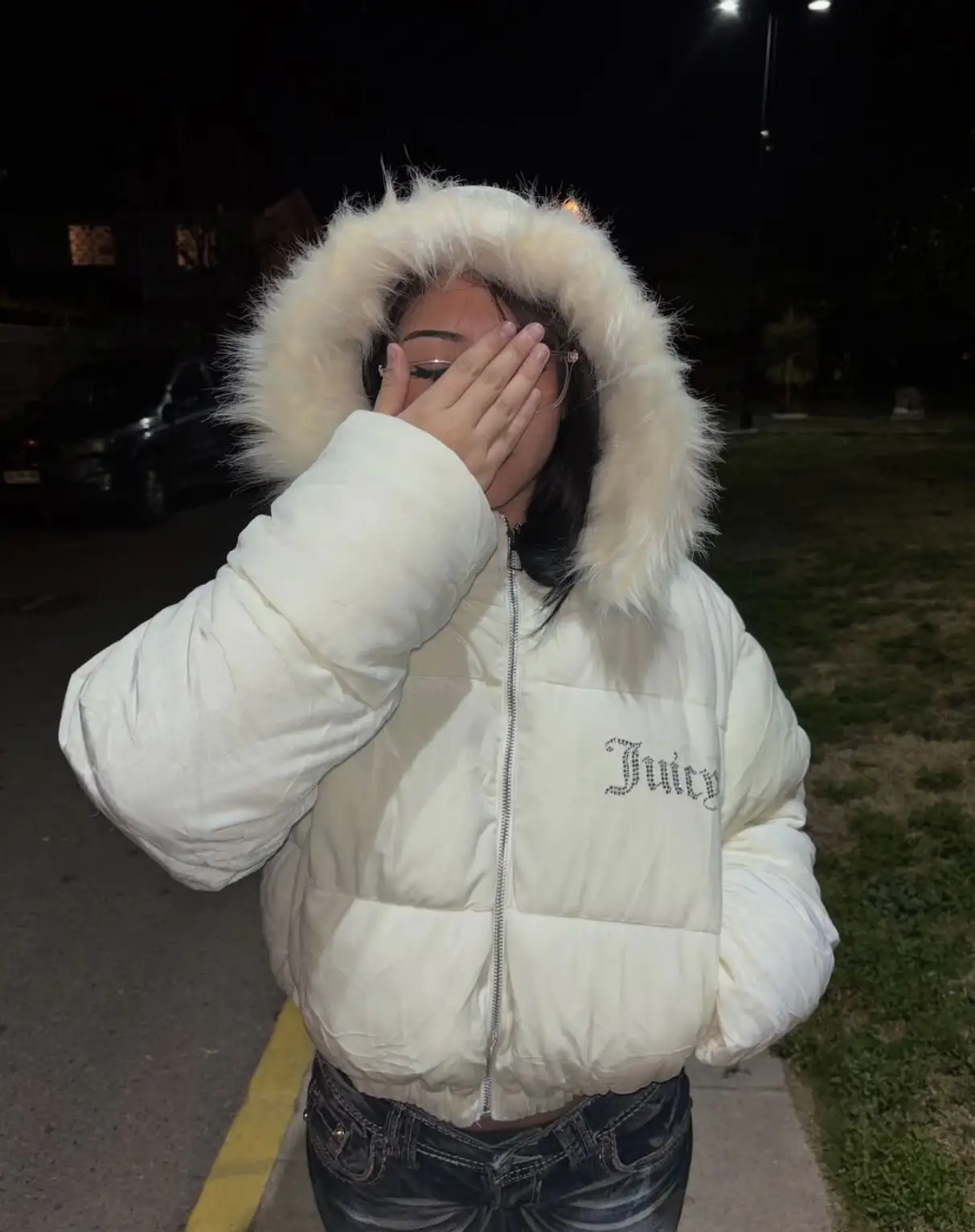 Beyaz Juicy Peluş Kapüşonlu Şişme Crop Mont