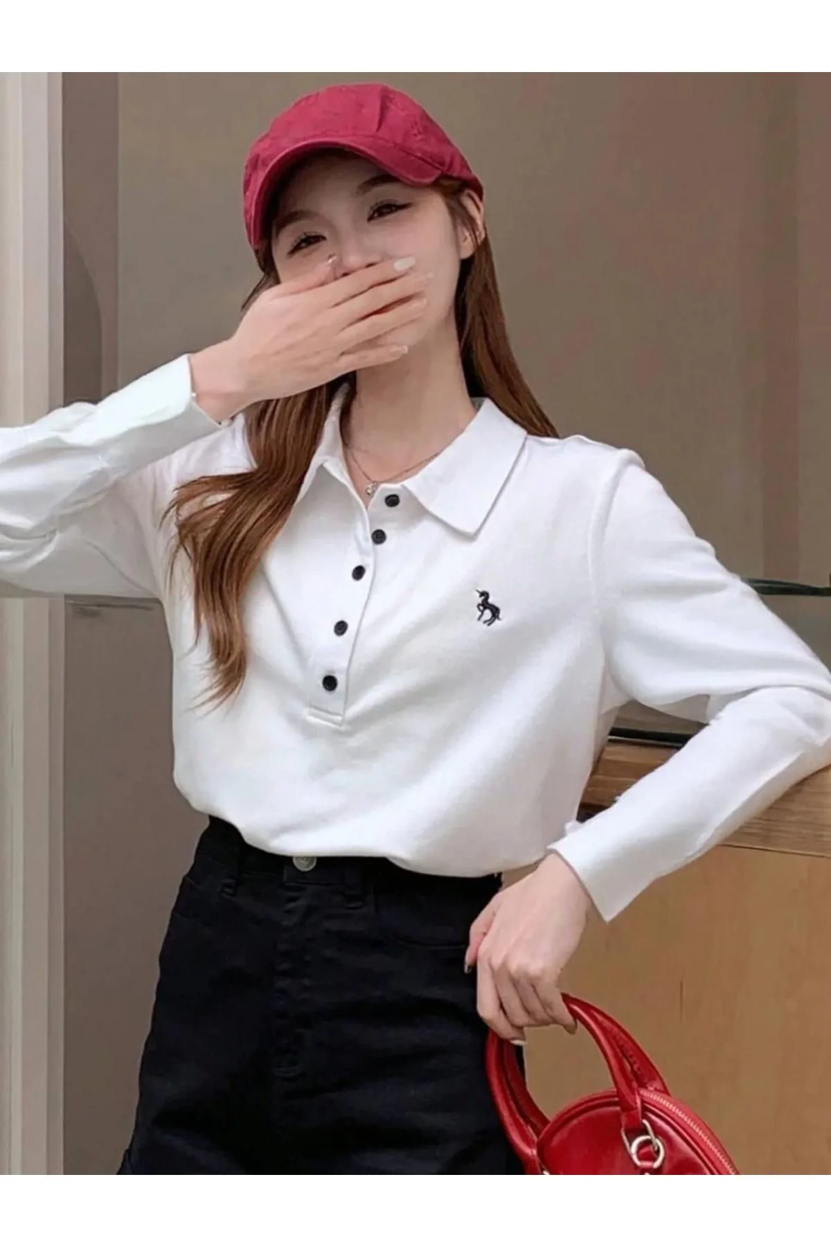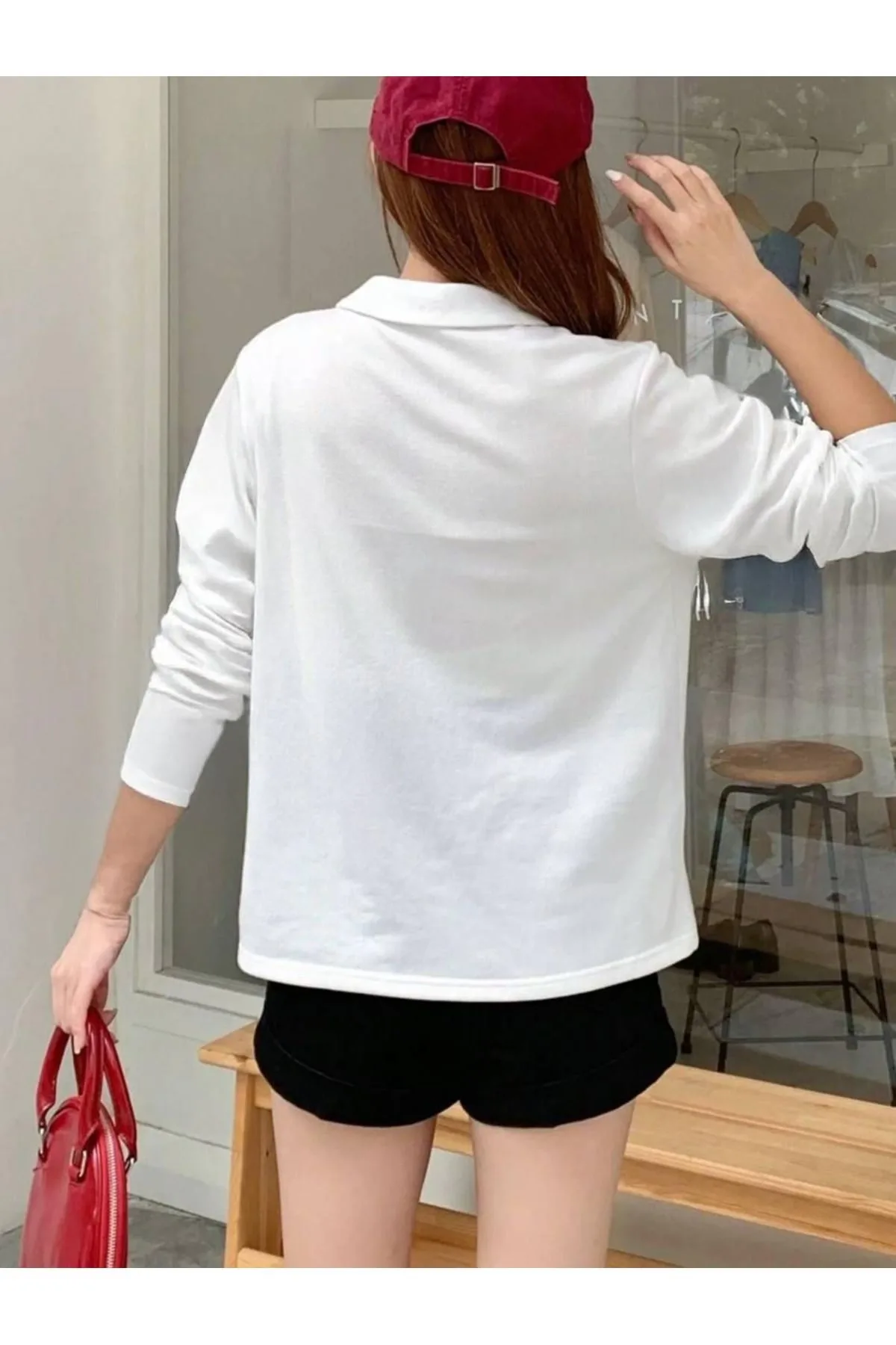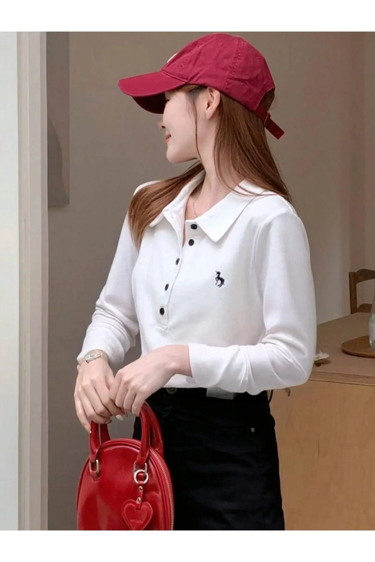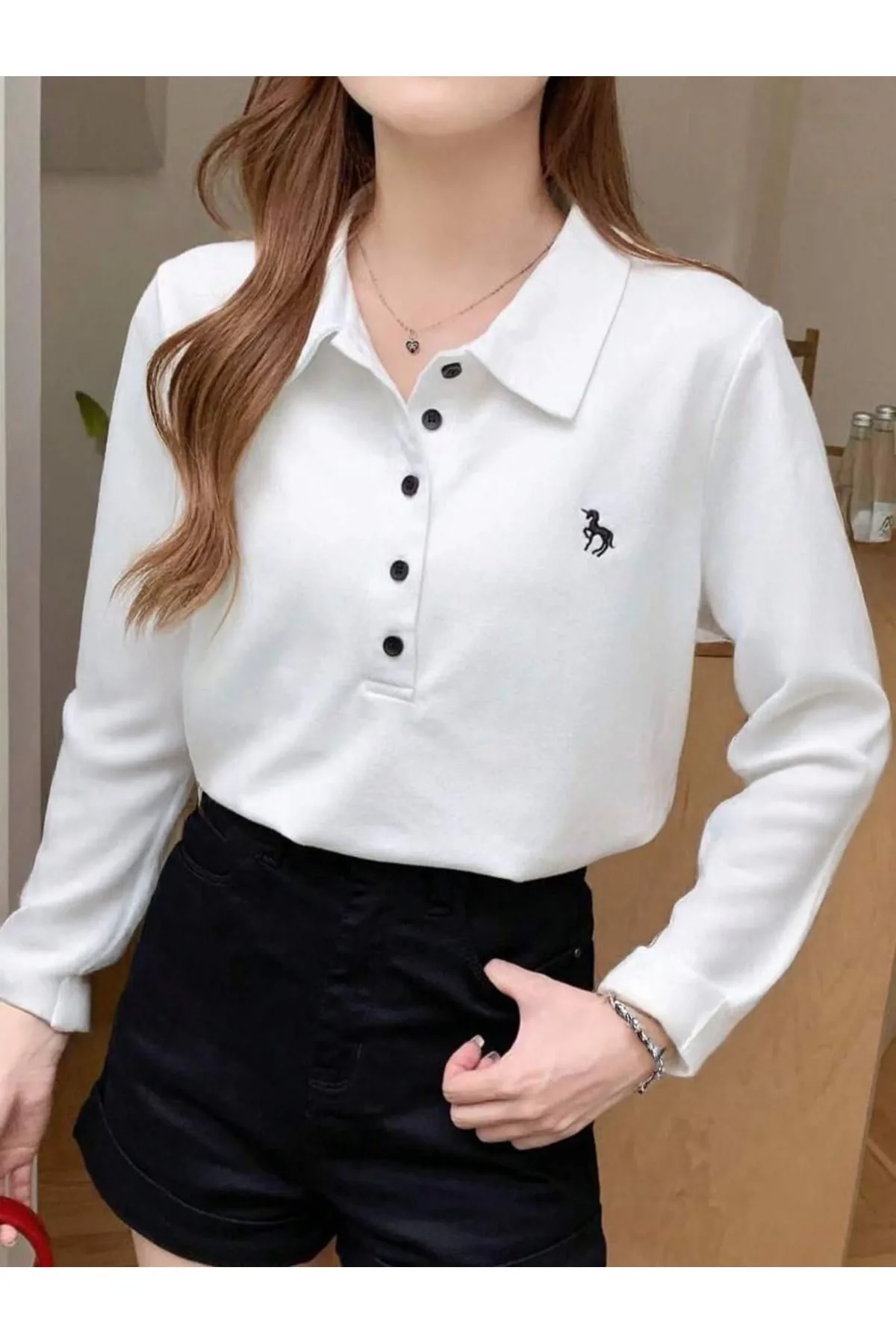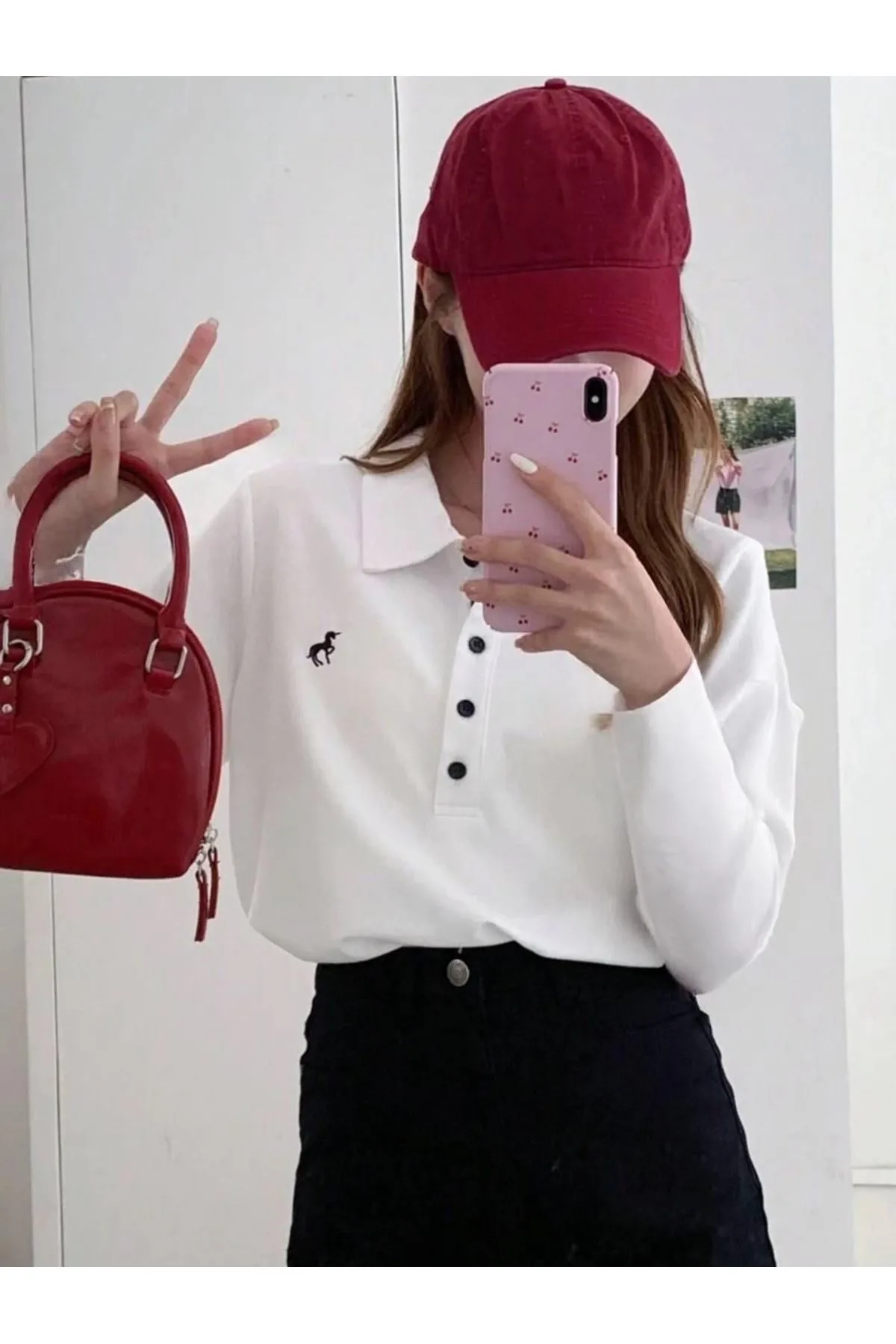 Beyaz Nakışlı Polo Yaka Uzun Kol T-shirt