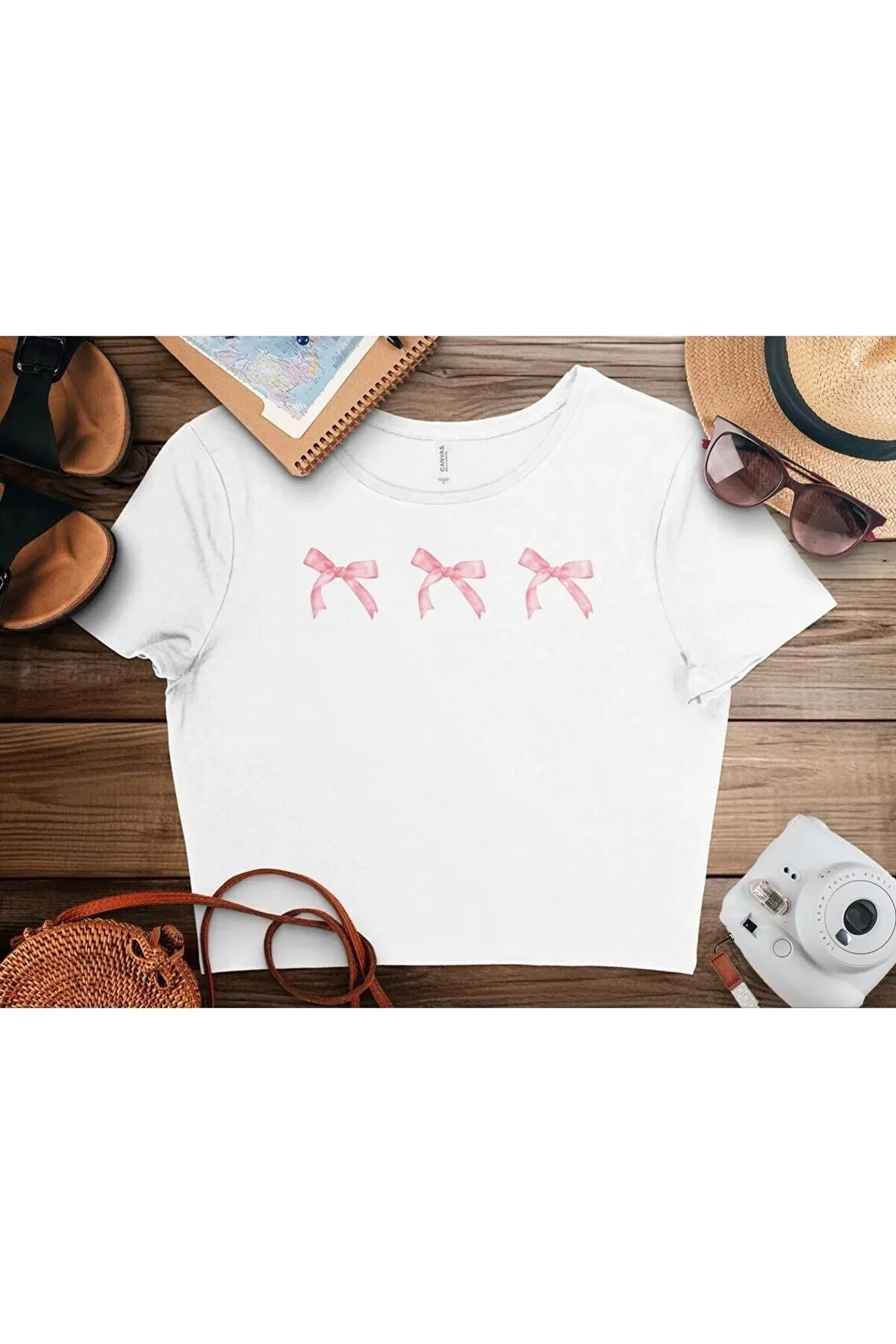 Beyaz Pembe Kurdele Fiyonk Desenli Crop Body