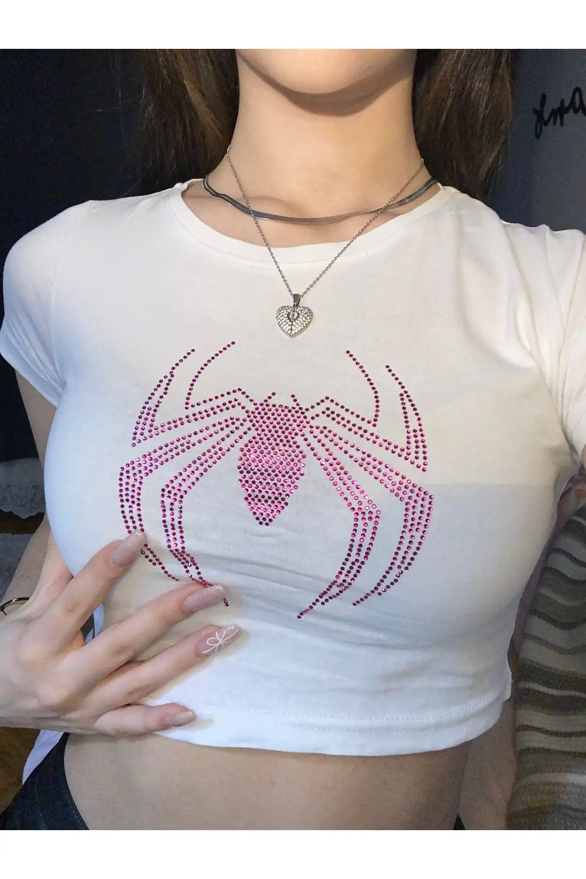 Beyaz Pembe Parıltılı Taşlı Örümcek Spiderman Kadın Crop Body