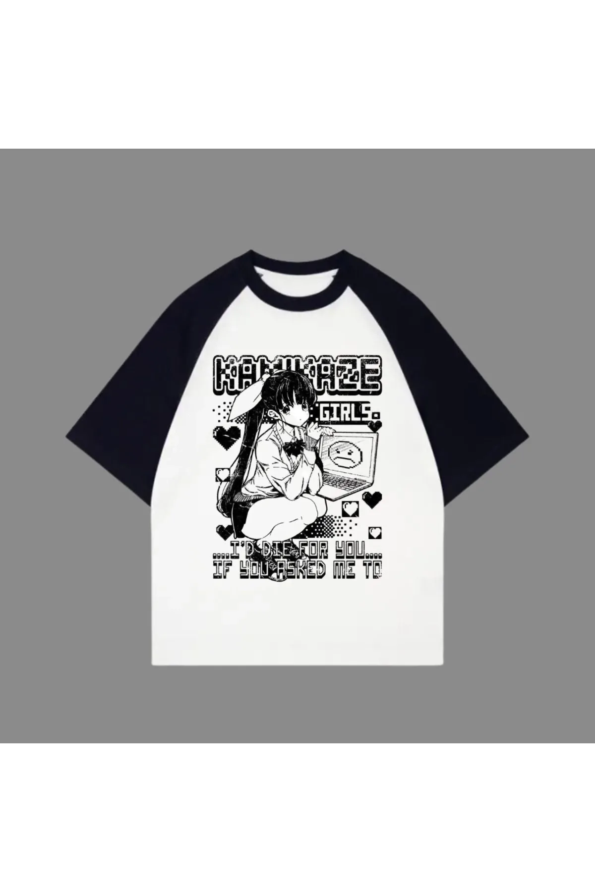 Beyaz Unisex Siyah Reglan Kamikaze T-Shirt