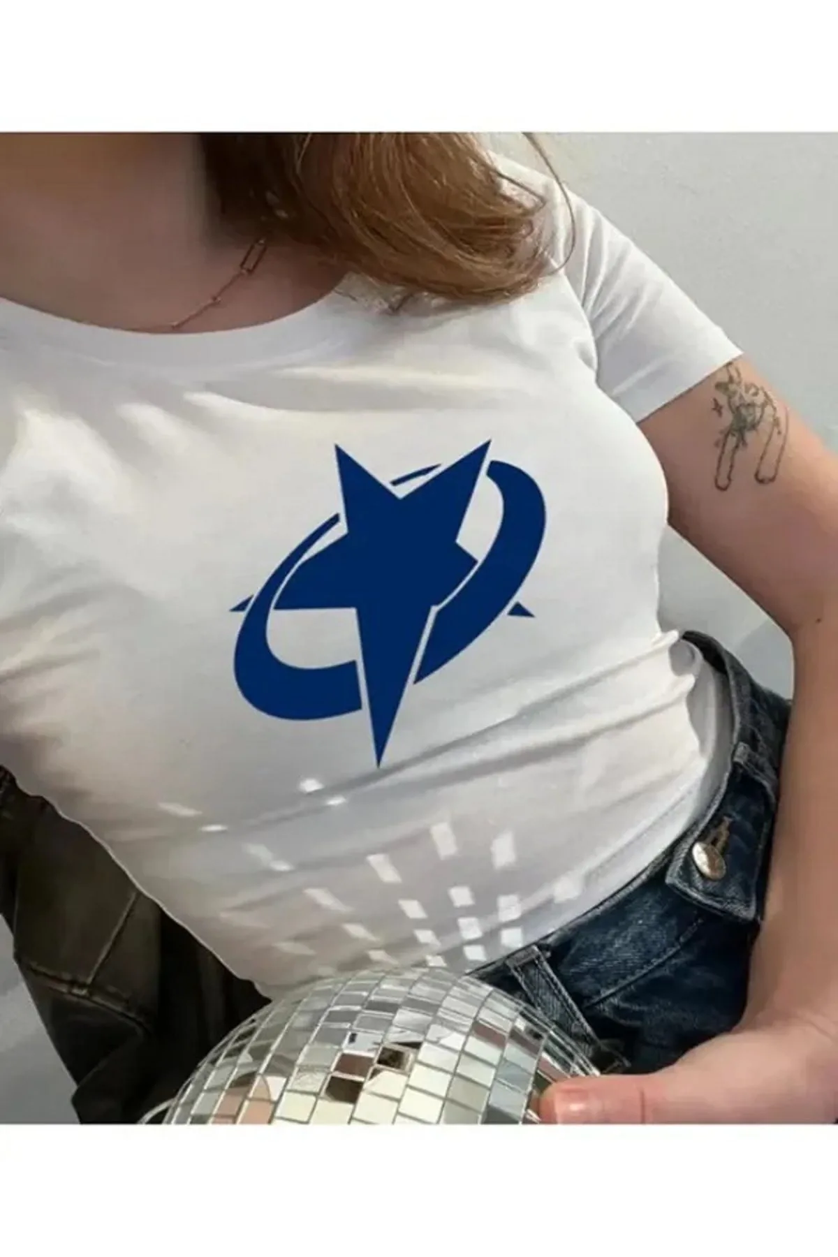 Beyaz Y2K Mavi Yıldız Sokak Stili Desenli Kısa Kollu Body Tshirt Crop Top