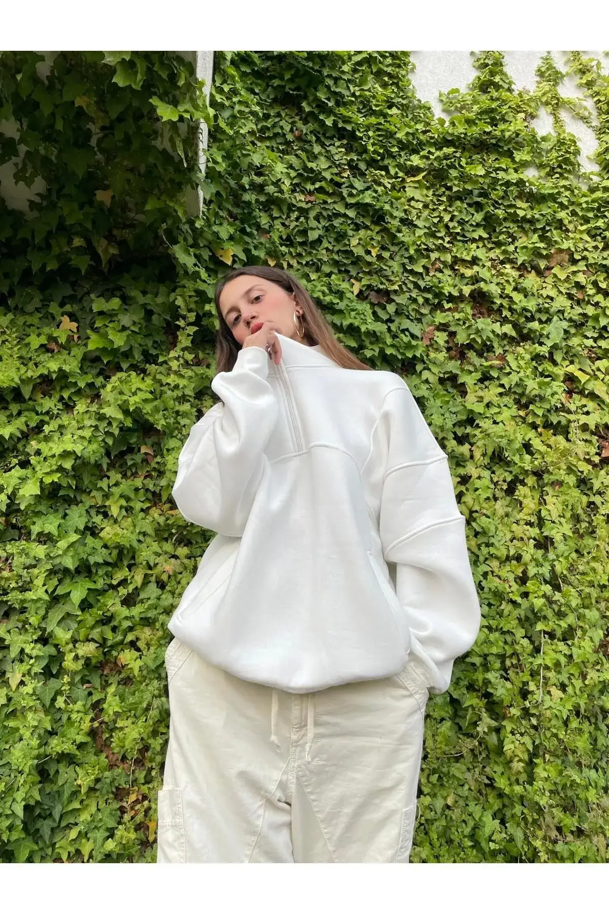 Beyaz Yarım Fermuarlı Oversize Sweatshirt