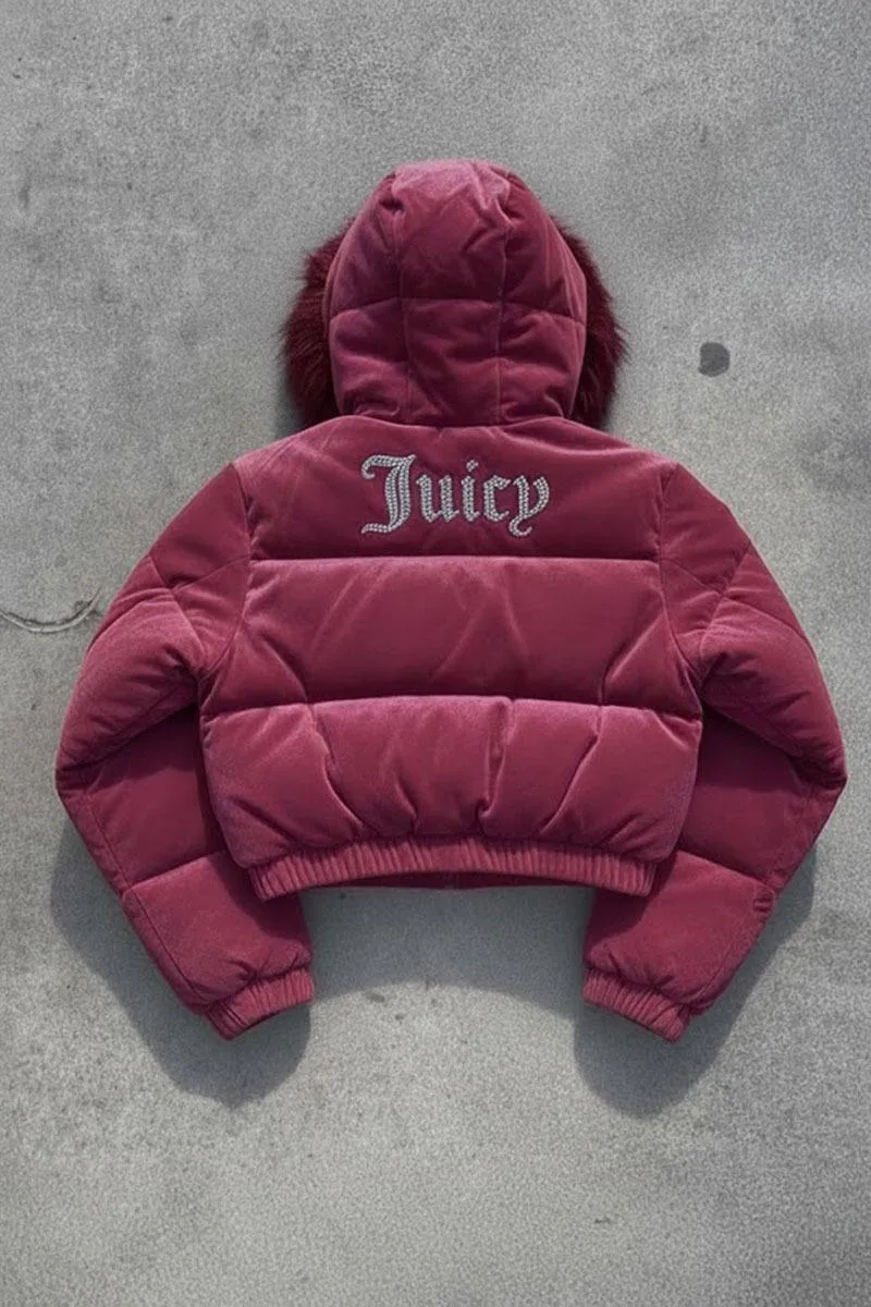 Pembe Juicy Peluş Kapüşonlu Şişme Crop Mont
