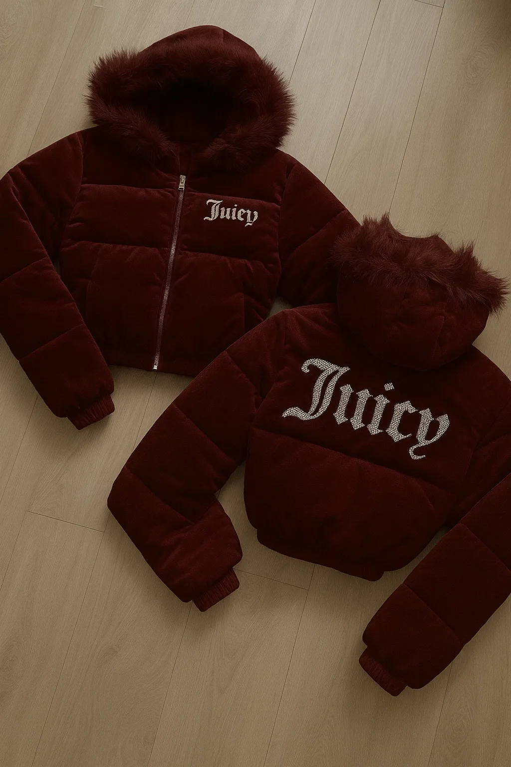 Bordo Juicy Peluş Kapüşonlu Şişme Crop Mont
