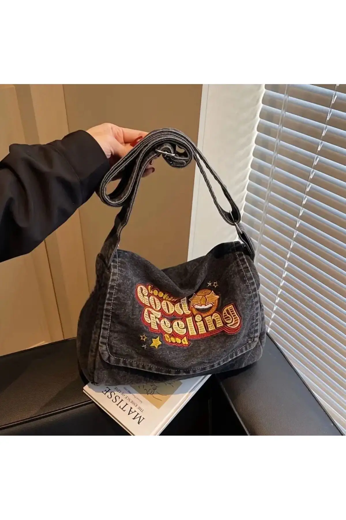 Good Feeling Text Yıkamalı Kot Postacı Çantası -Minga London