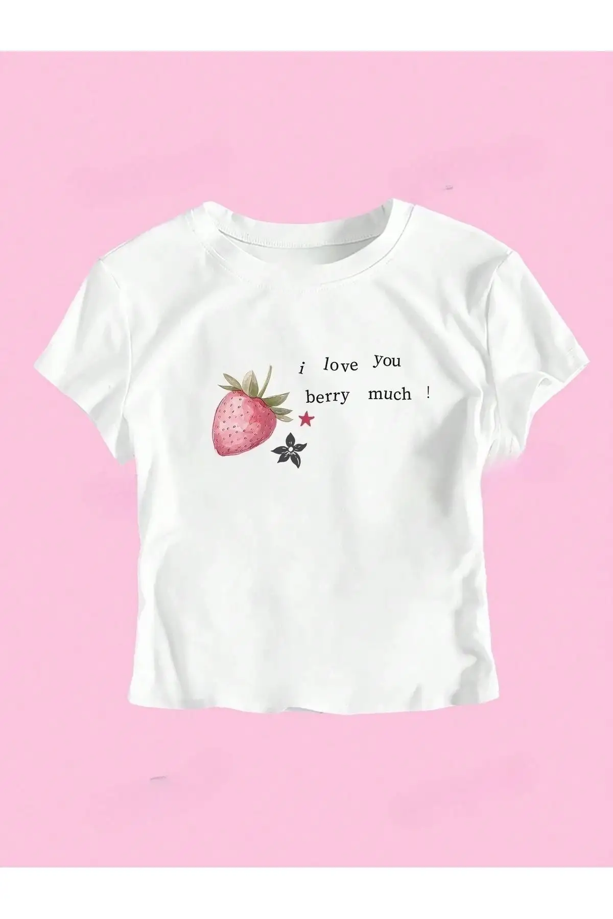 Kadın Beyaz Y2K I Love Berry Baskılı Bayb Tee Crop