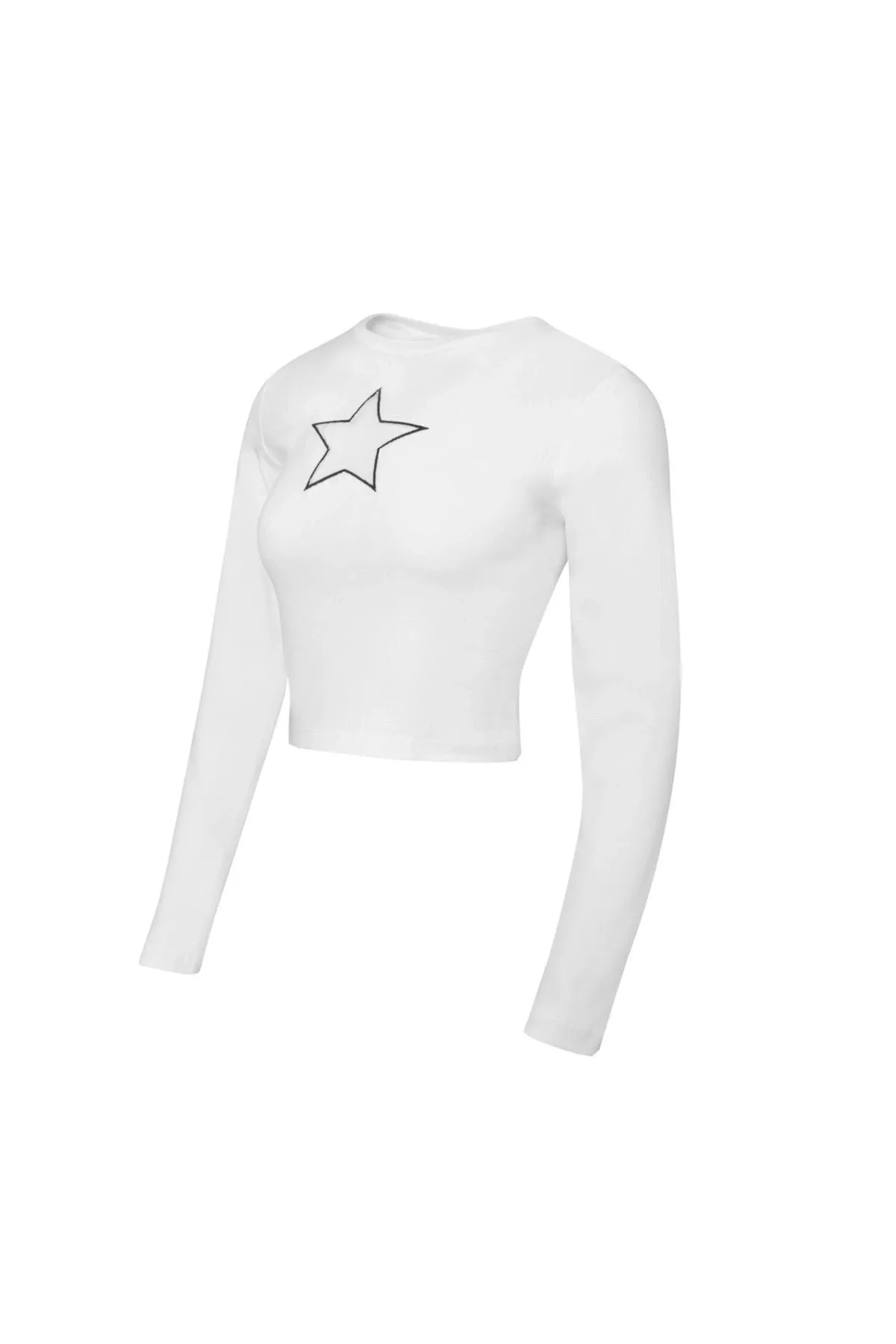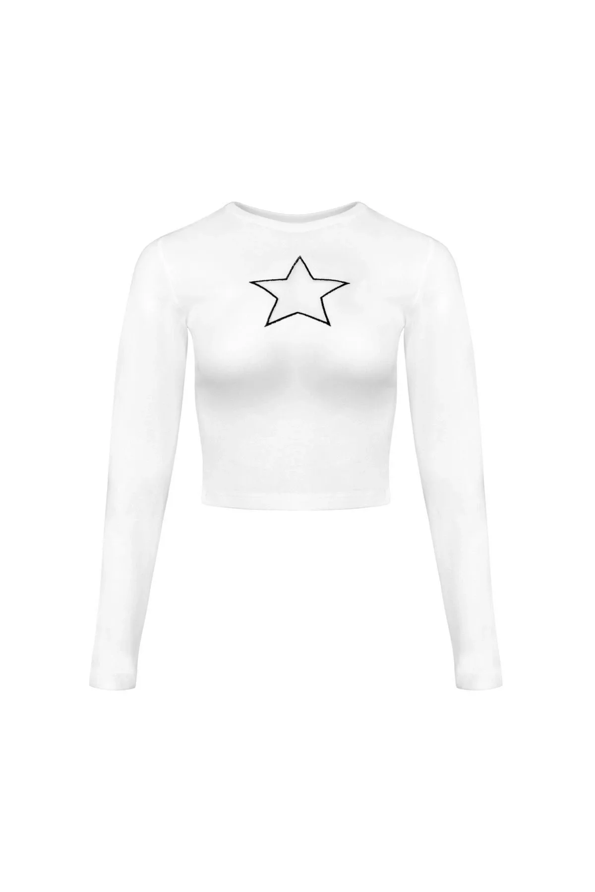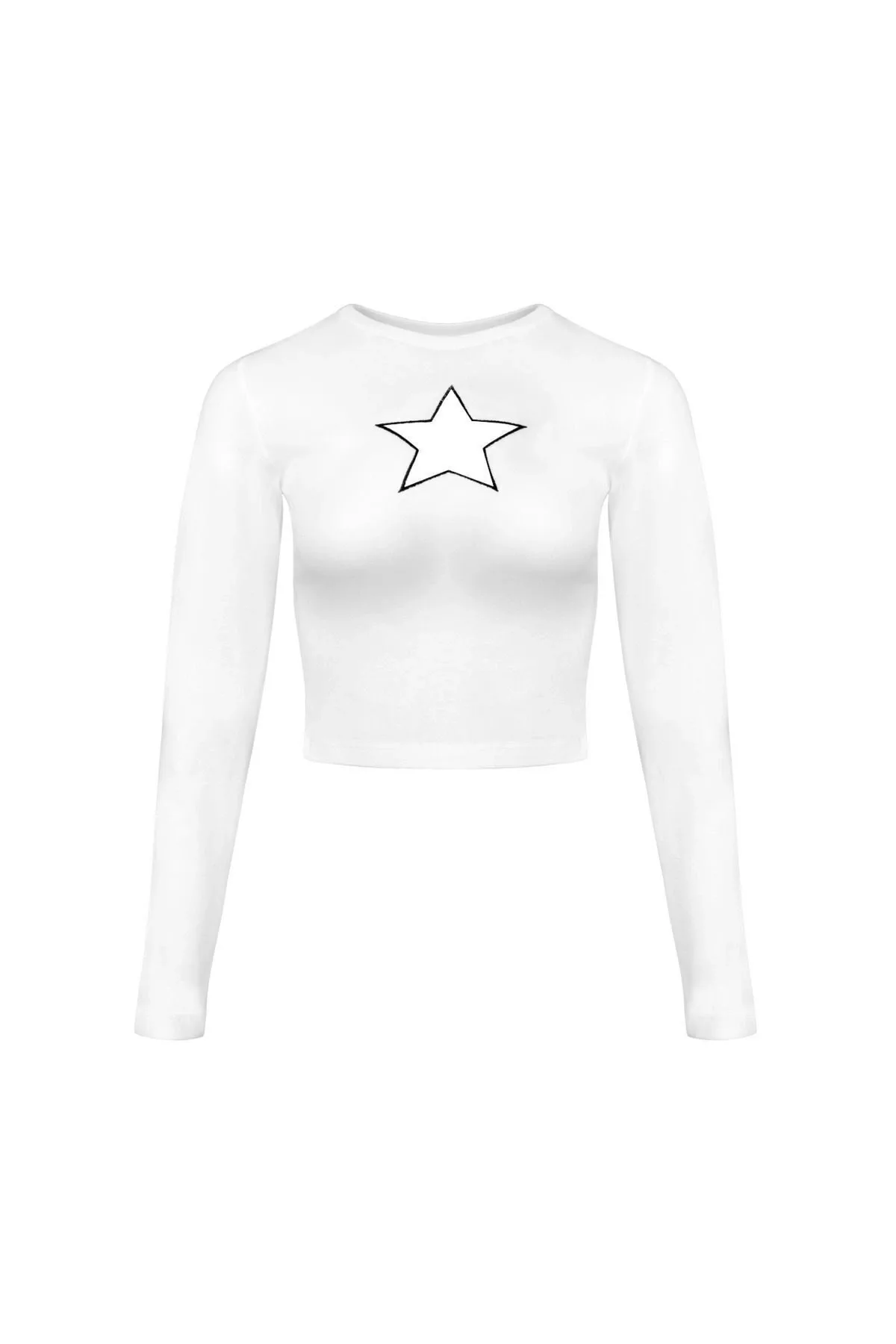 Yıldız Desenli Transparan Detaylı Uzun Kollu Beyaz Crop Top Bluz