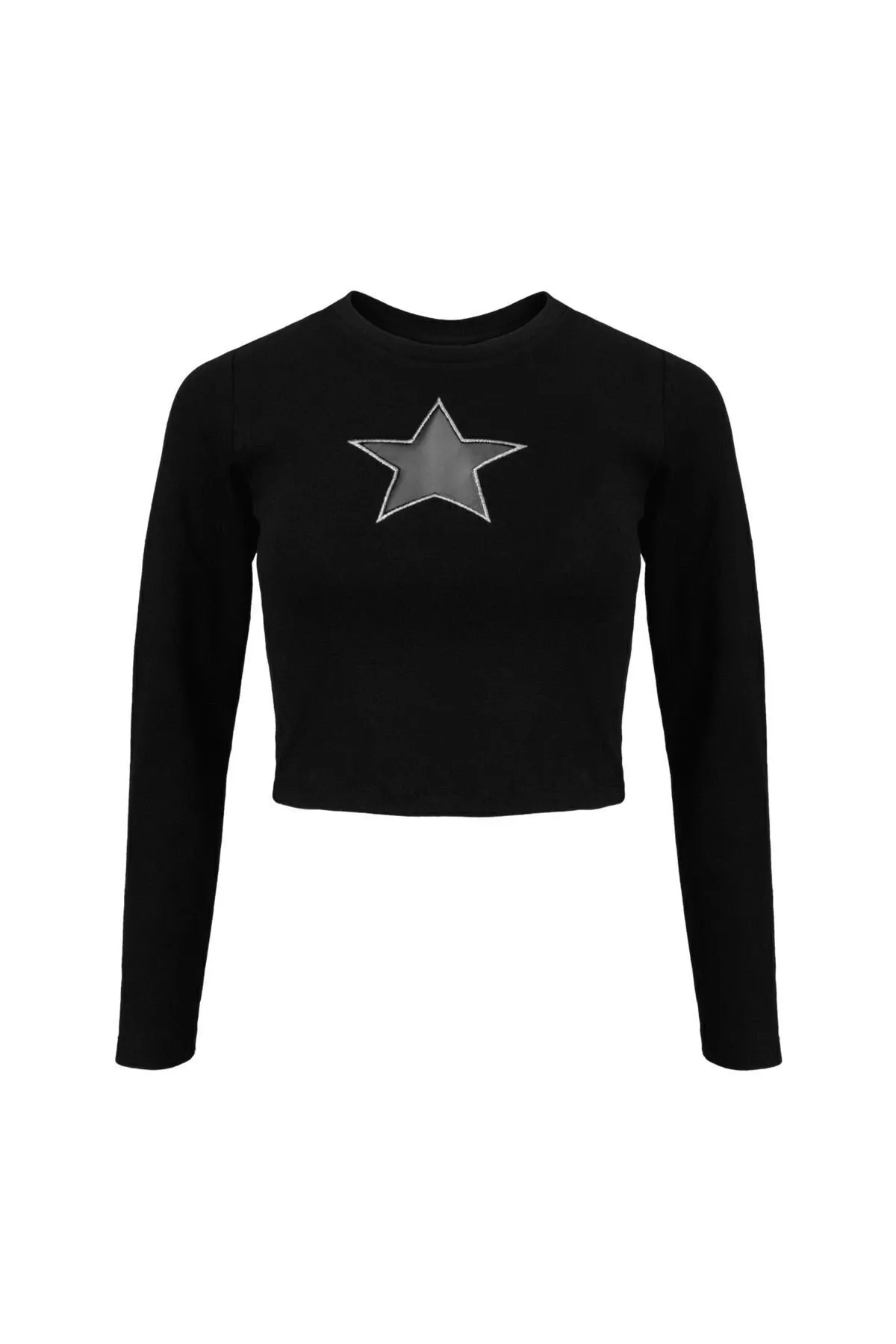 Yıldız Desenli Transparan Detaylı Uzun Kollu Siyah Crop Top Bluz