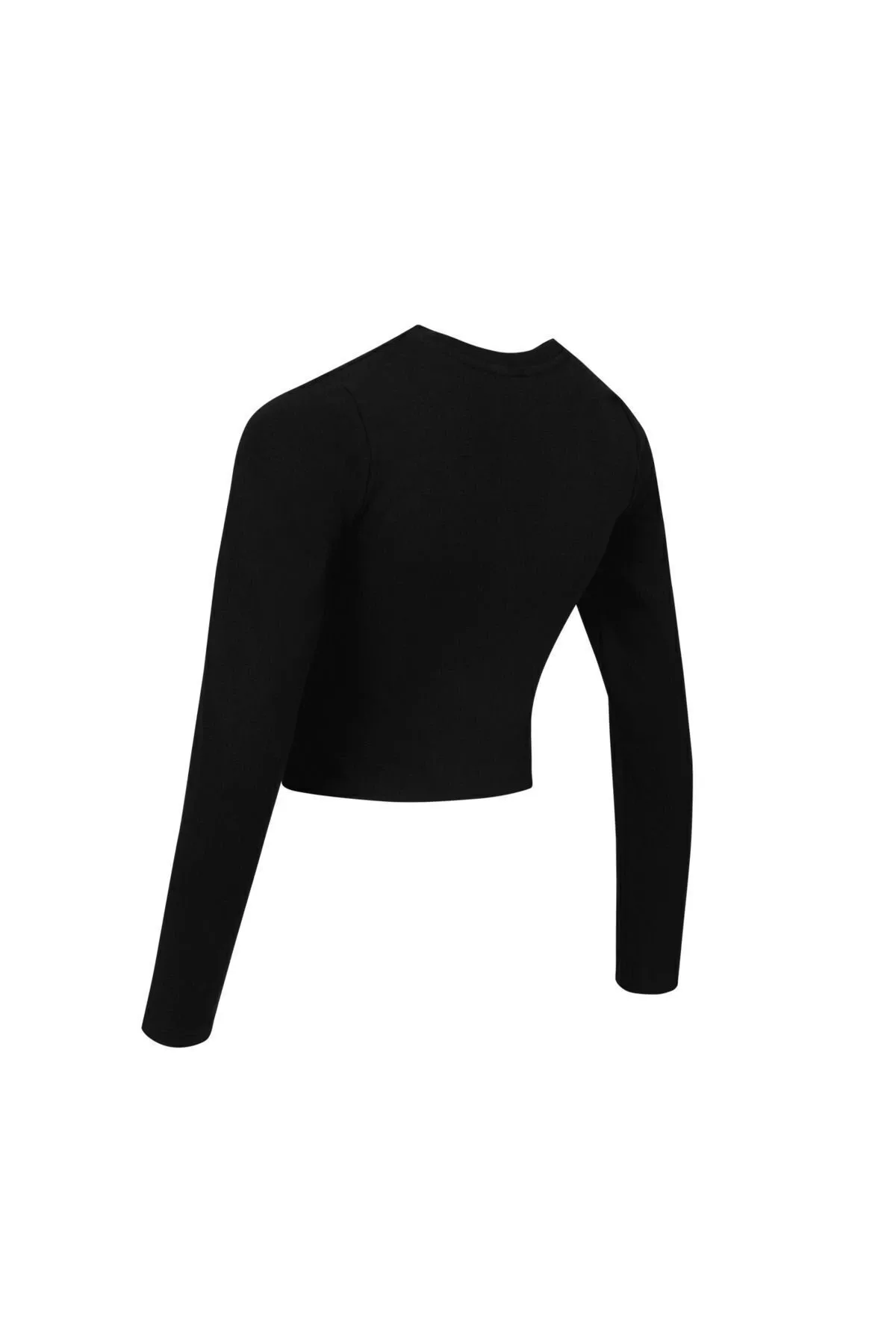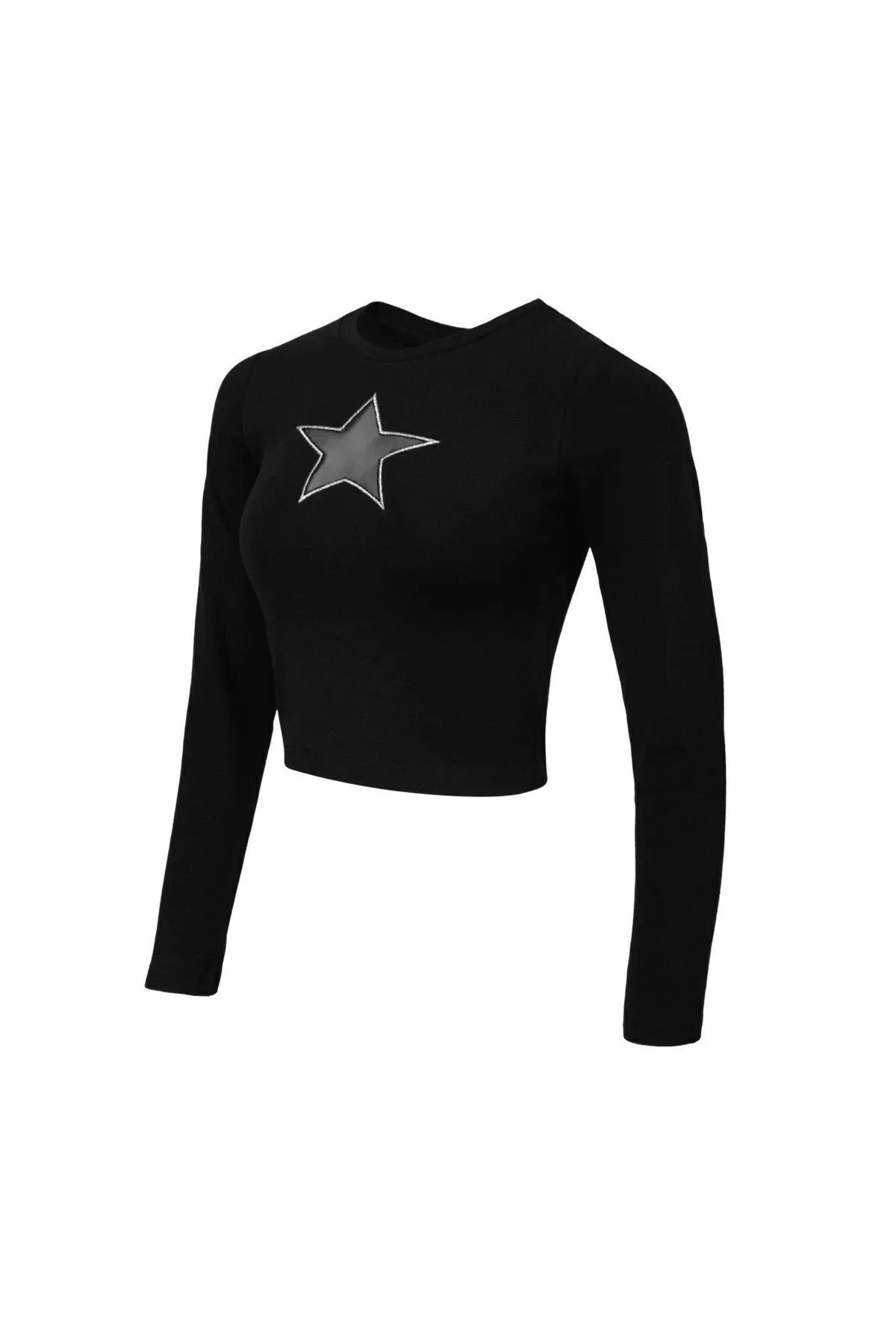 Kadın Bisiklet Yaka Pamuklu Yıldız Desenli Transparan Detaylı Uzun Kollu Siyah Crop Top Bluz