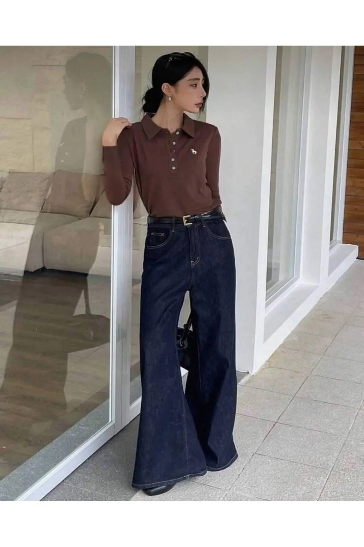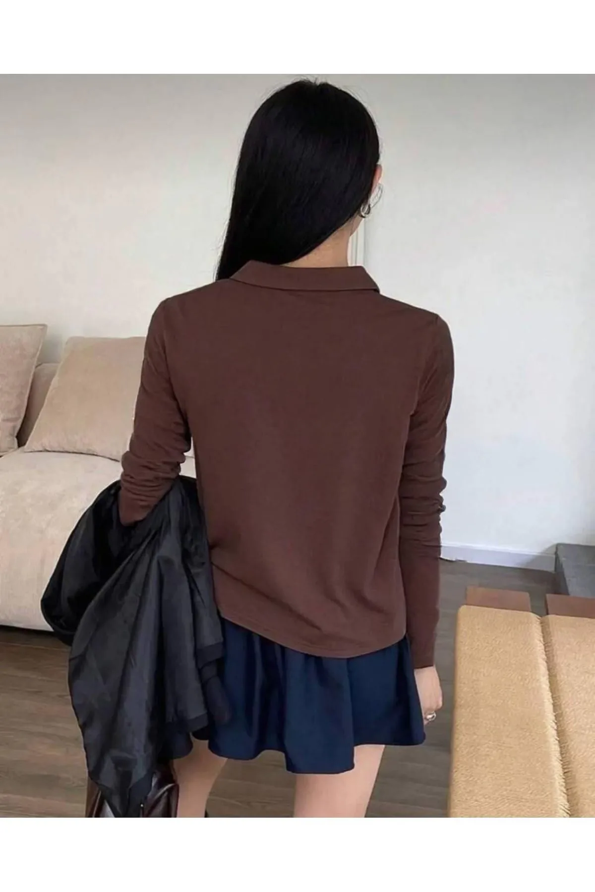 Kahverengi Nakışlı Polo Yaka Uzun Kol T-shirt