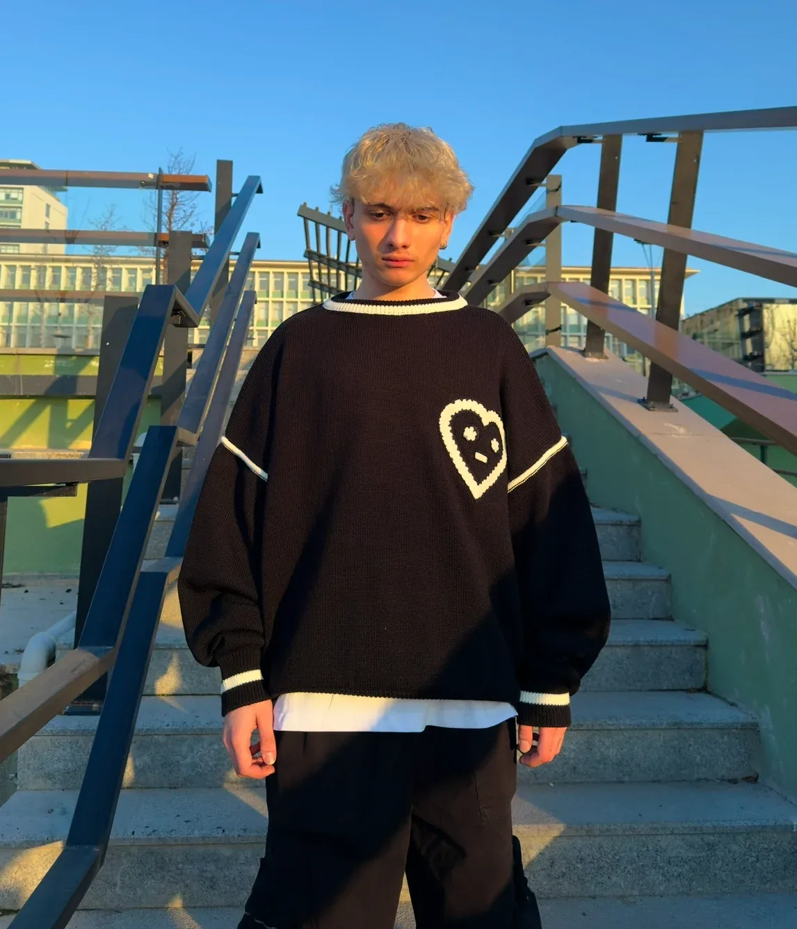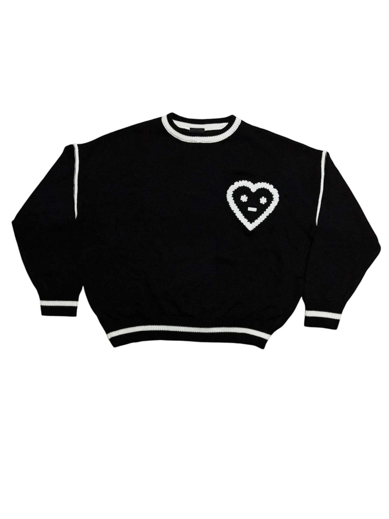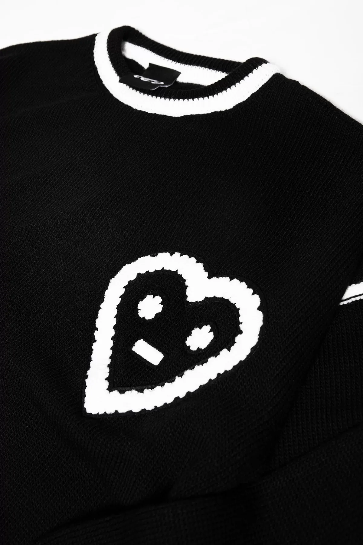 Kalp Nakış Detay Ara Çizgili Siyah Triko Kazak