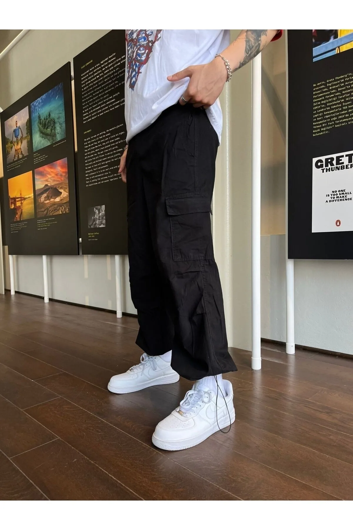Extra Baggy Kargo Cepli Tactical Paraşüt Kumaş Bol Paça Siyah Renk Pantolon
