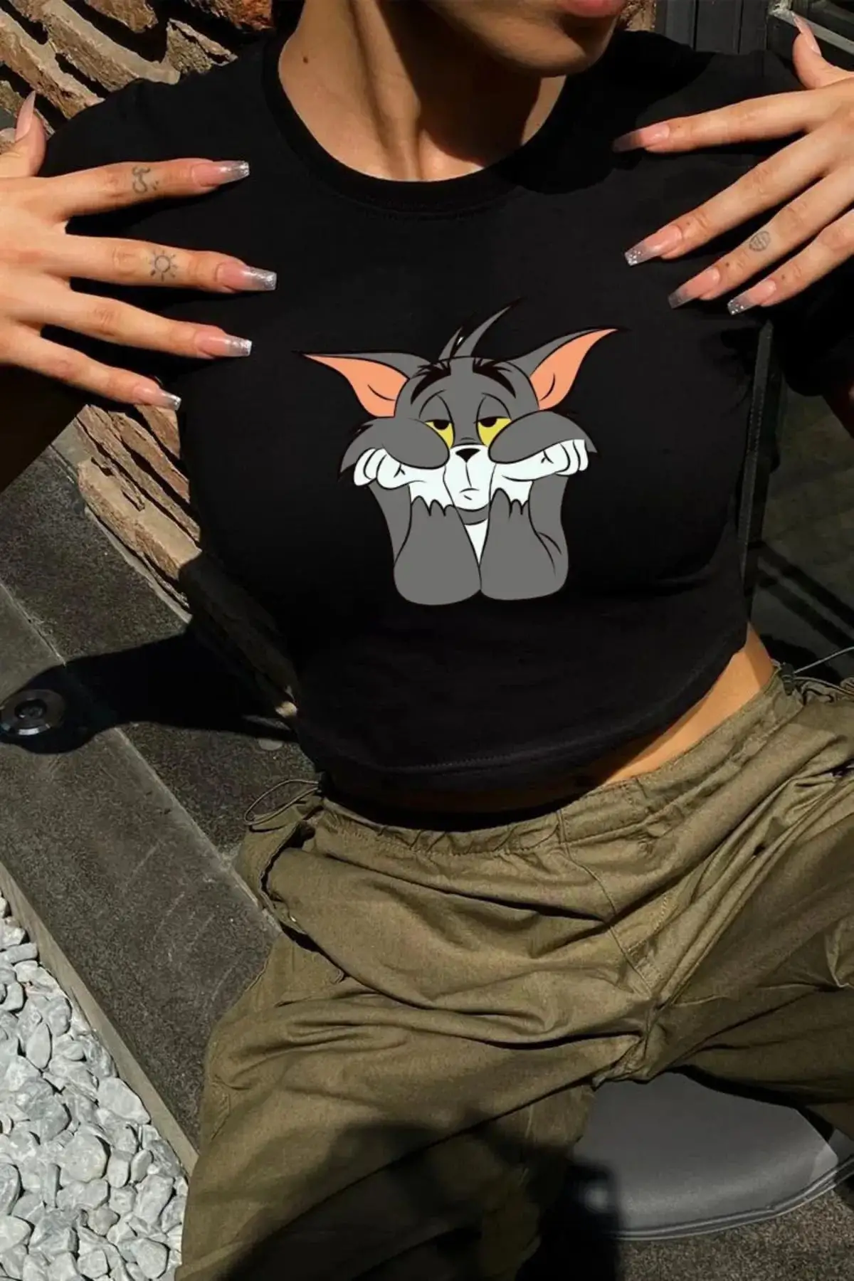 Kedi Tom Baskılı Desenli Kısa Kollu Siyah Crop Body