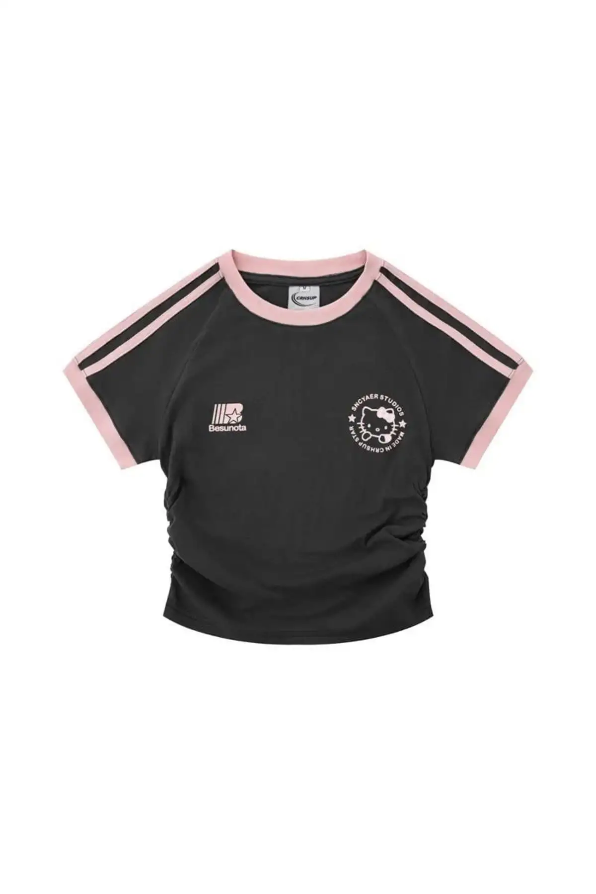 ?? Hello Kitty Büzgülü Siyah Crop – Pembe Detaylı, Kemer Boy Şıklık! ??