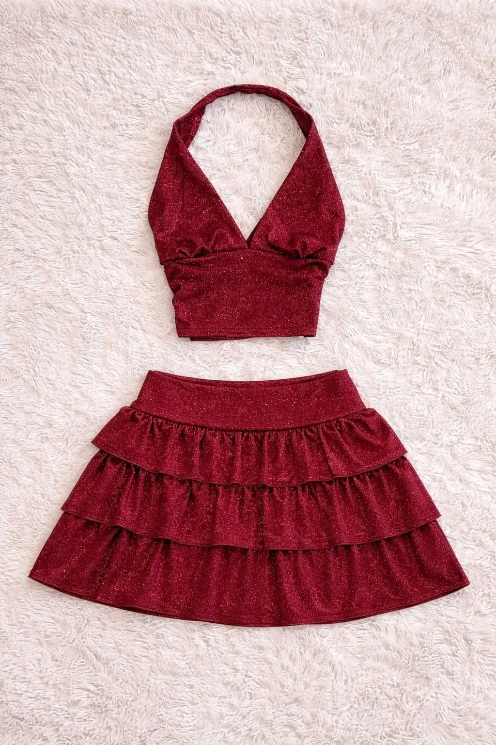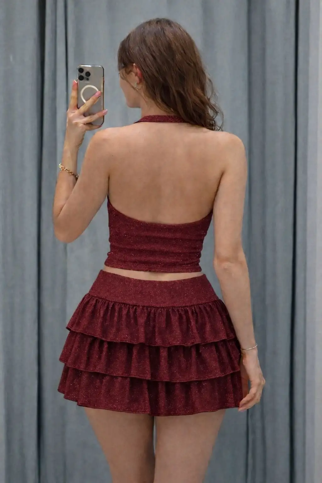 Kırmızı Ashley Sim Detaylı Şort Etek Bluz Takım