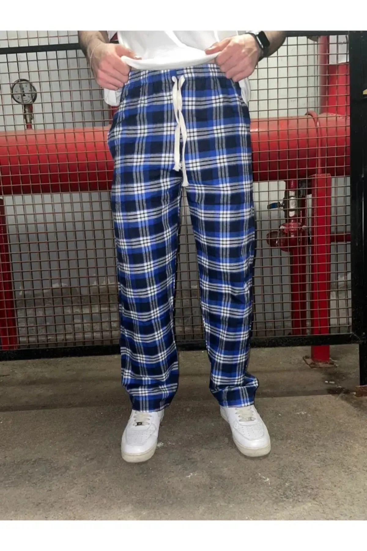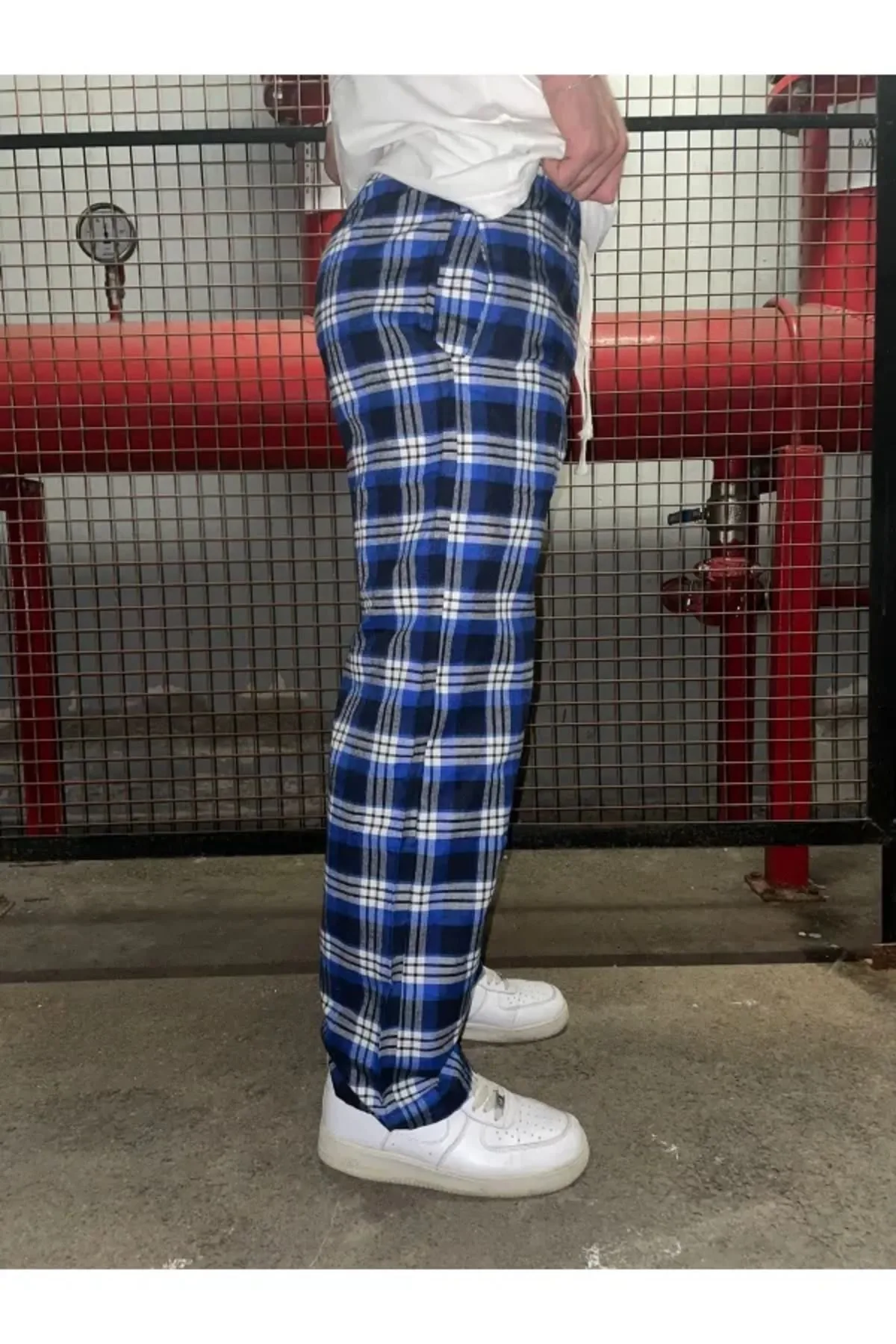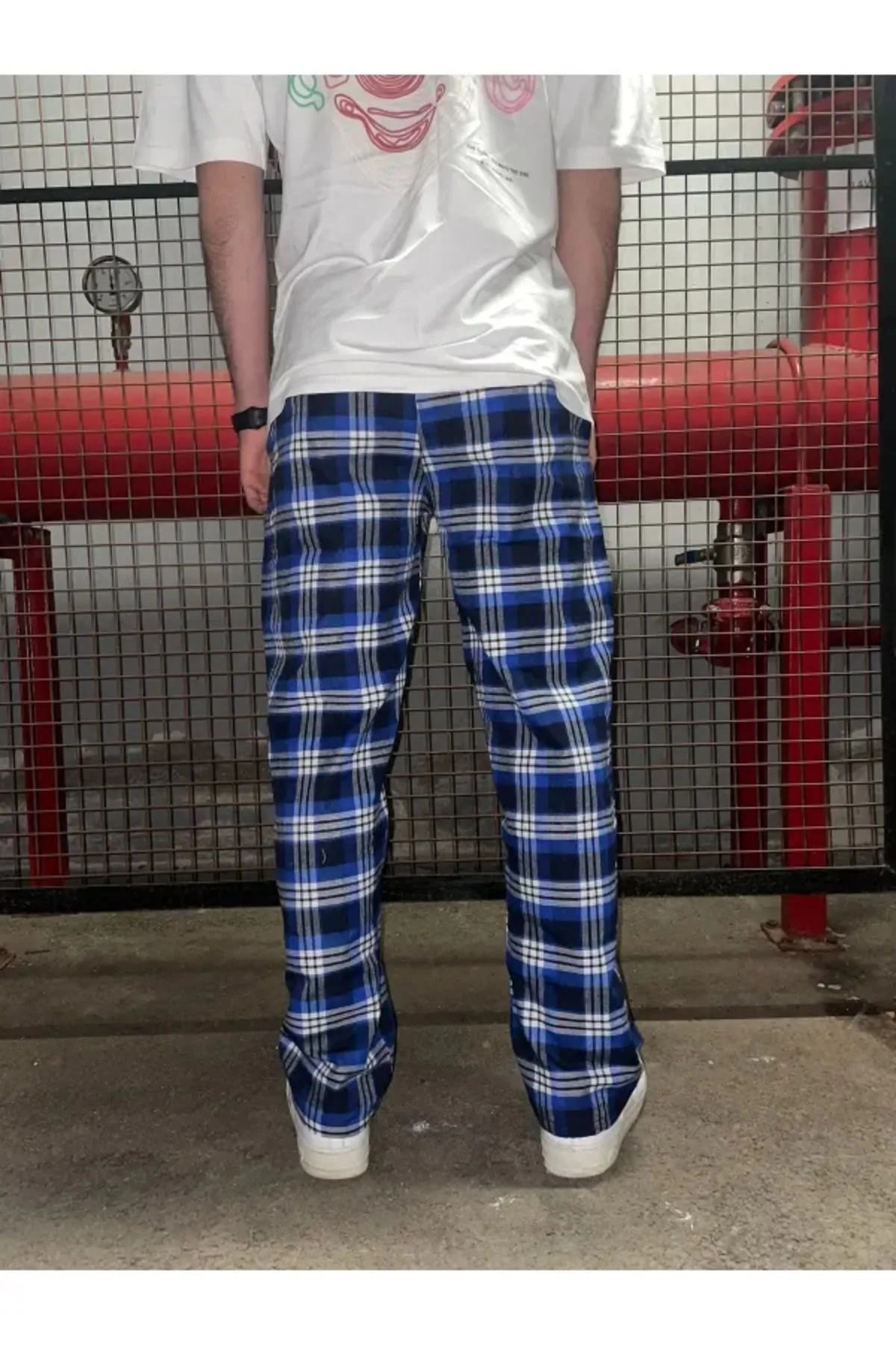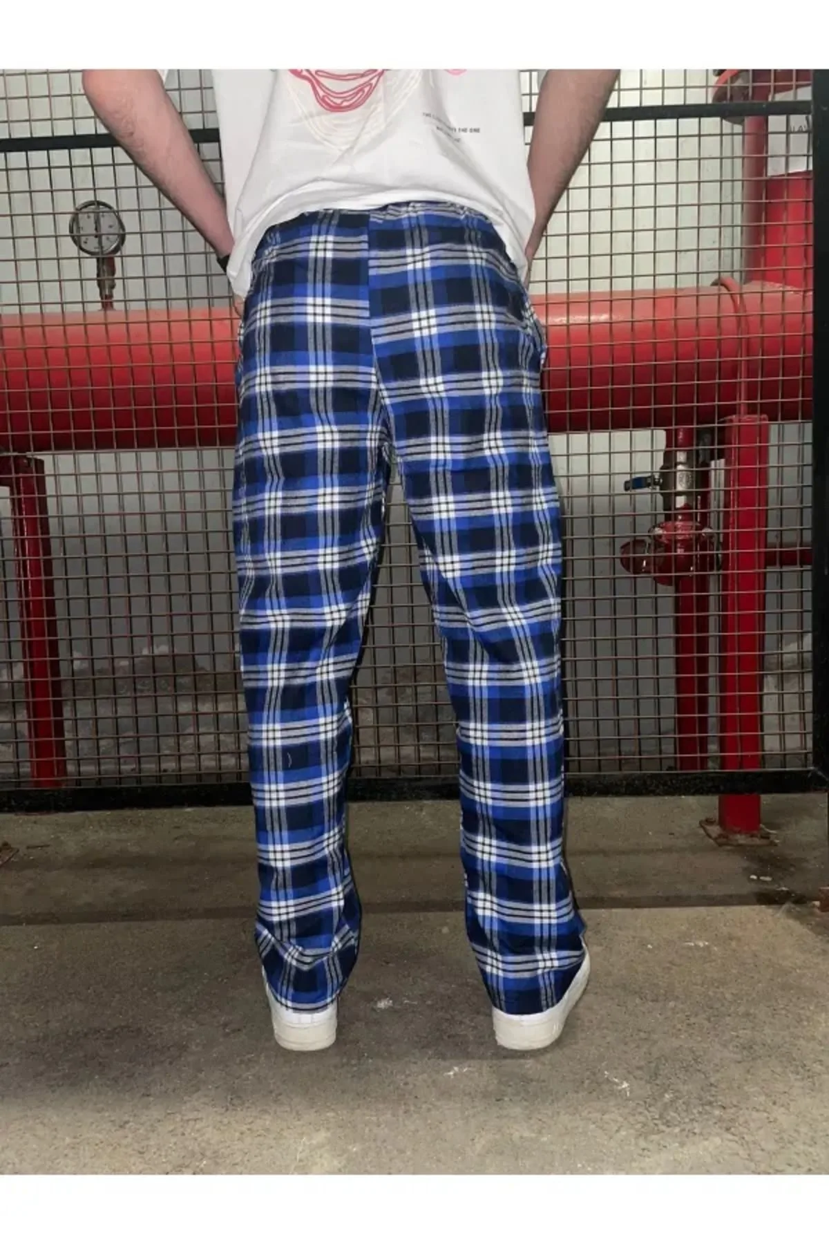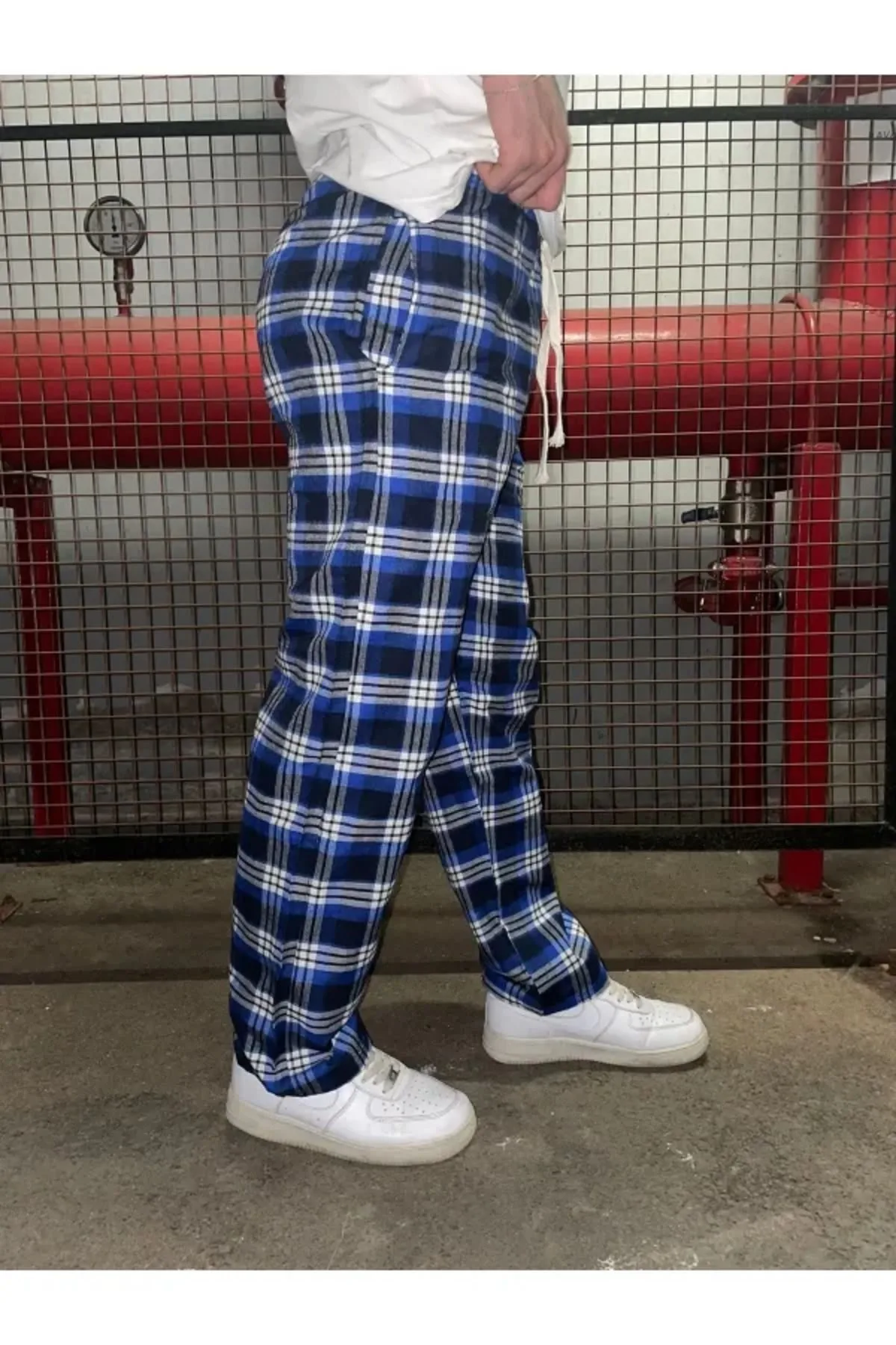 Mavi Beyaz Kare Ekose Desenli Unisex Oversize Eşfoman Altı Pijama