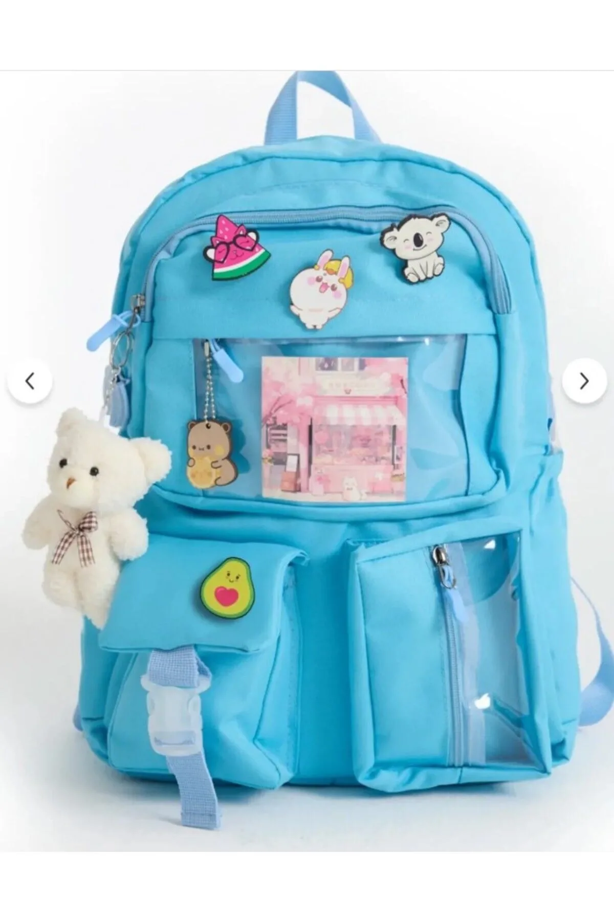 Mavi Kawaii Kore Tarzı Aksesuarlı Ve Ayıcıklı Premium Kalite Okul Sırt Çantası