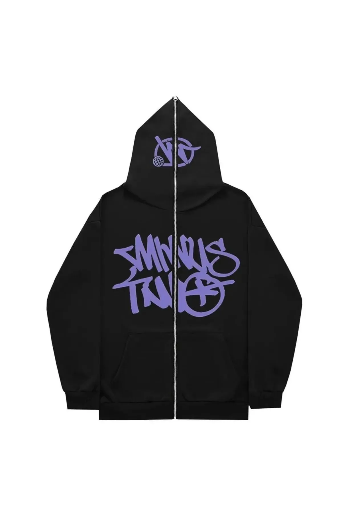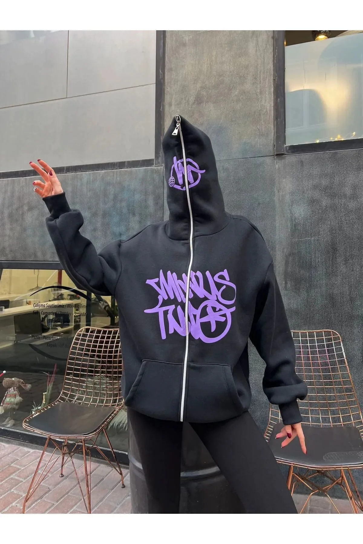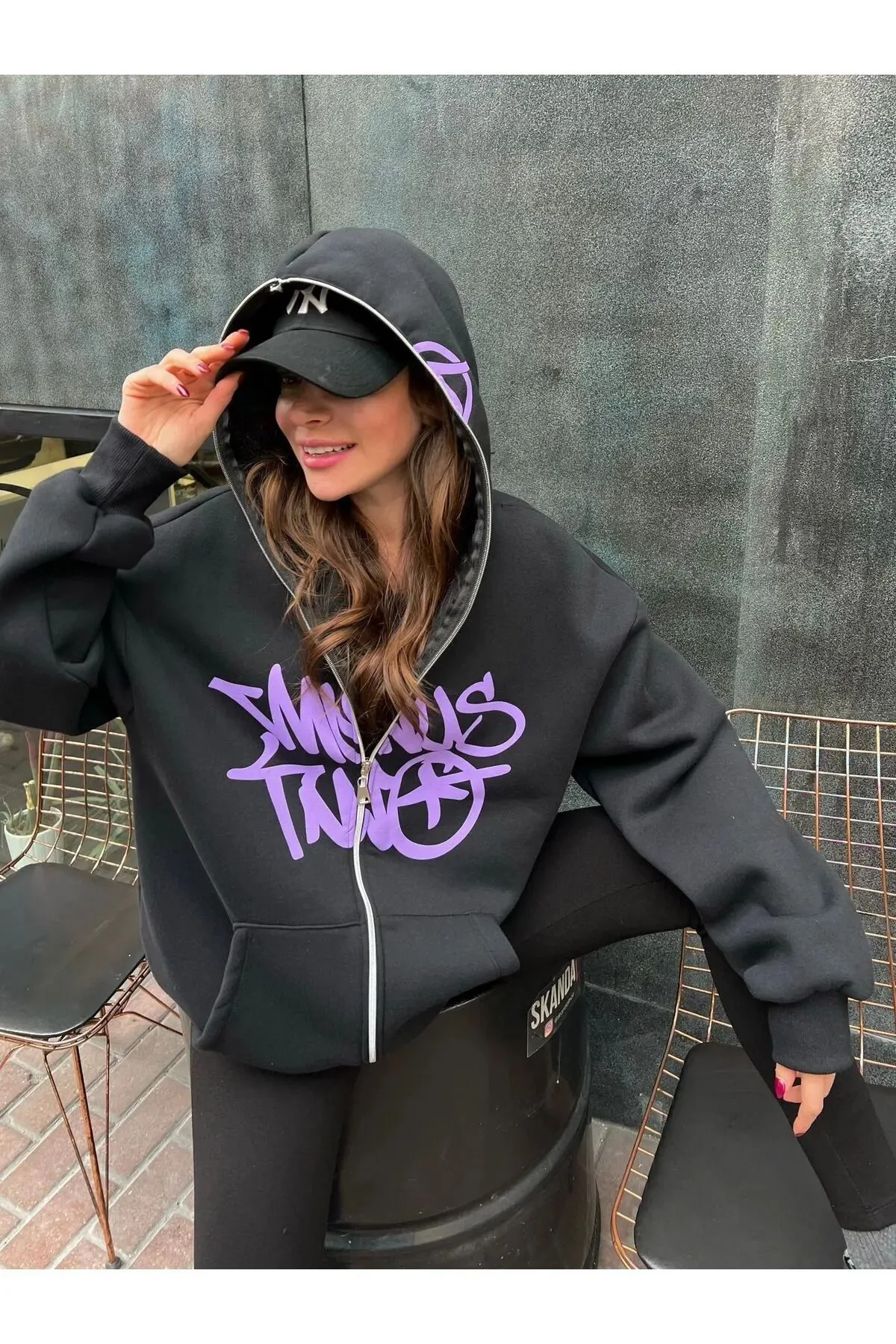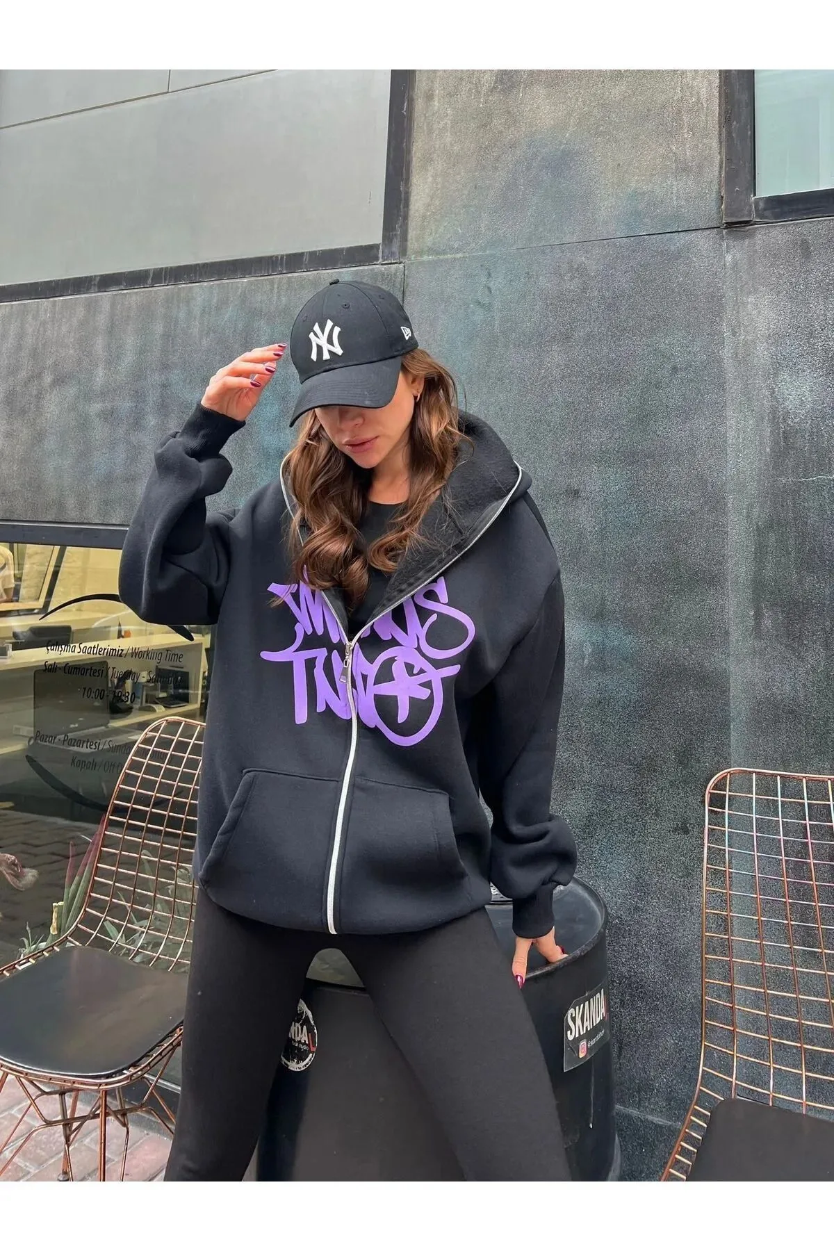 SİYAH Baskılı 3 iplik kalın Minus Hırka Two Detail Fermuarlı Unisex Oversize Ful Zip Hırka