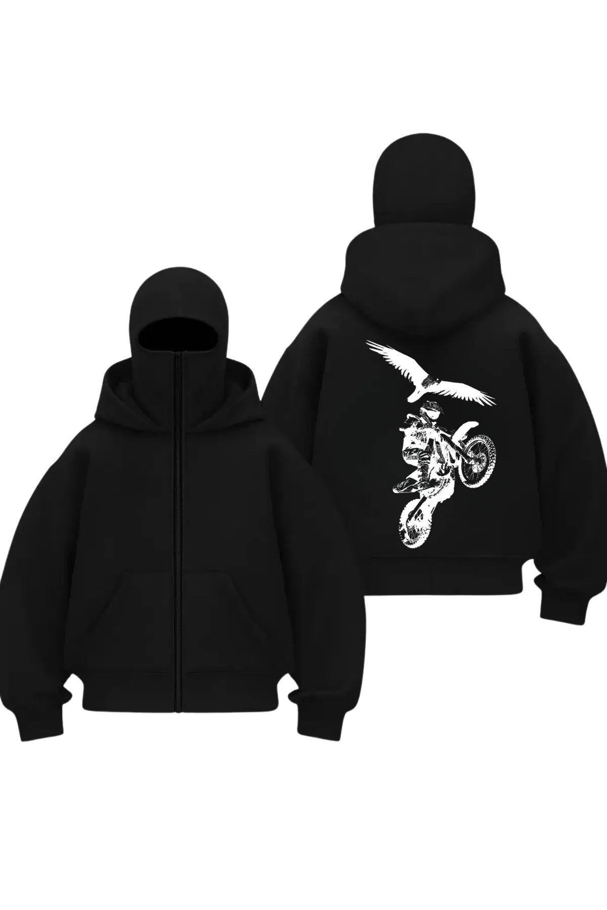 Motor Baskılı Siyah Samuray Kar Maske Sweatshirt Hırka