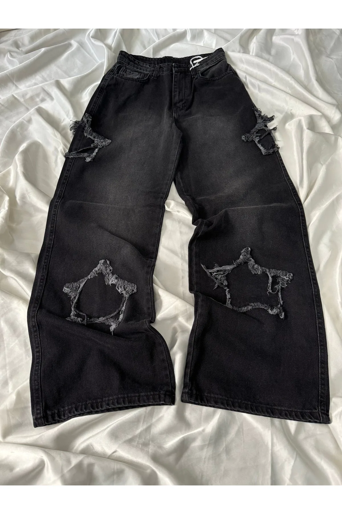 Parça Yıldızlı Siyah Taşlamalı Pantolon