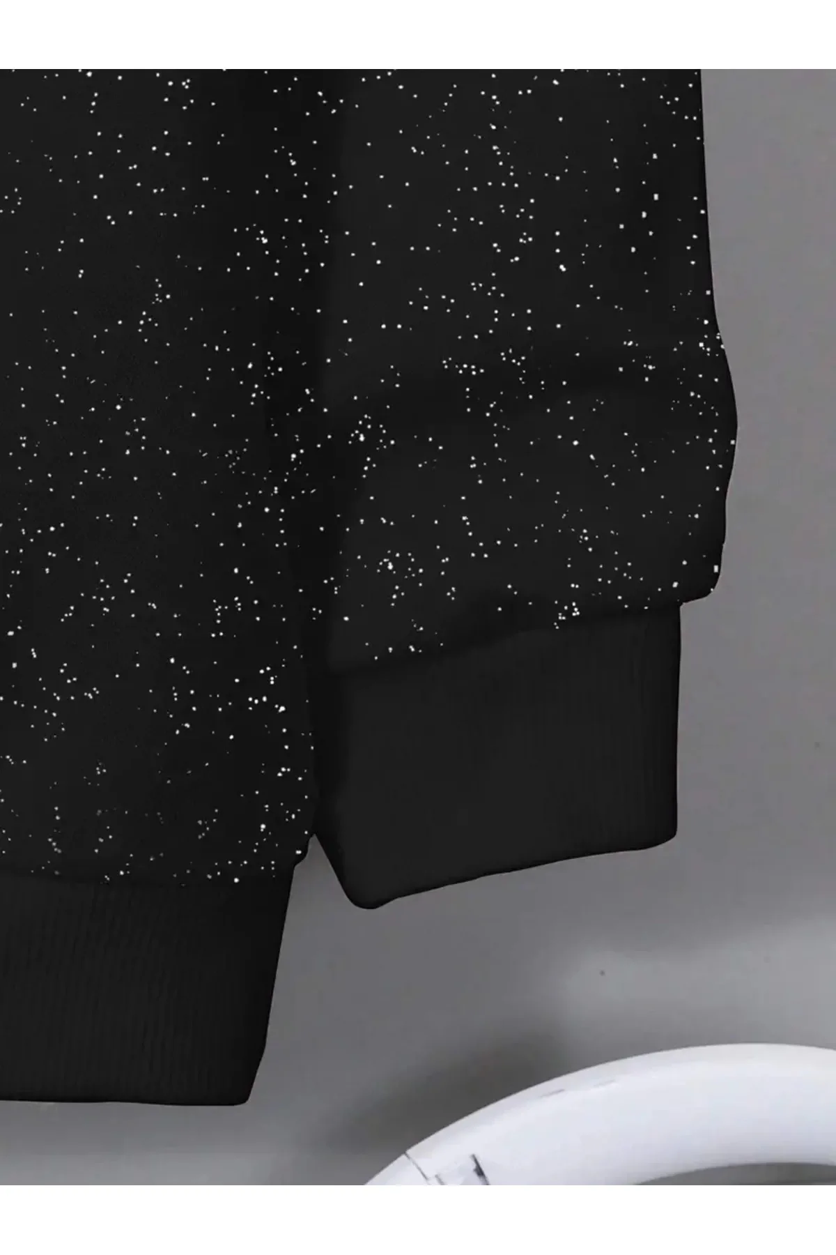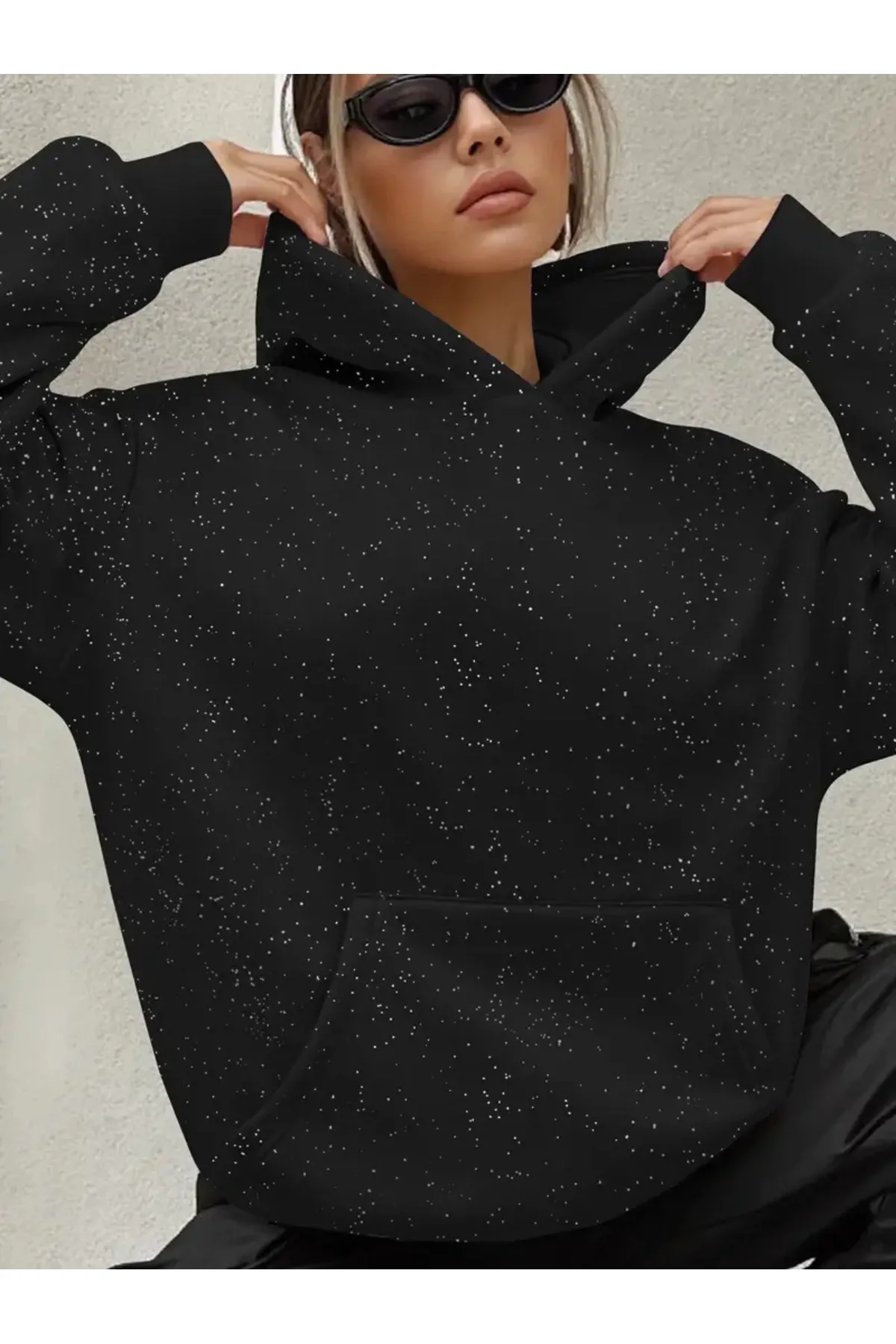 Parıltılı Taş Baskılı Kapüşonlu Oversize 3 İplik Sweat