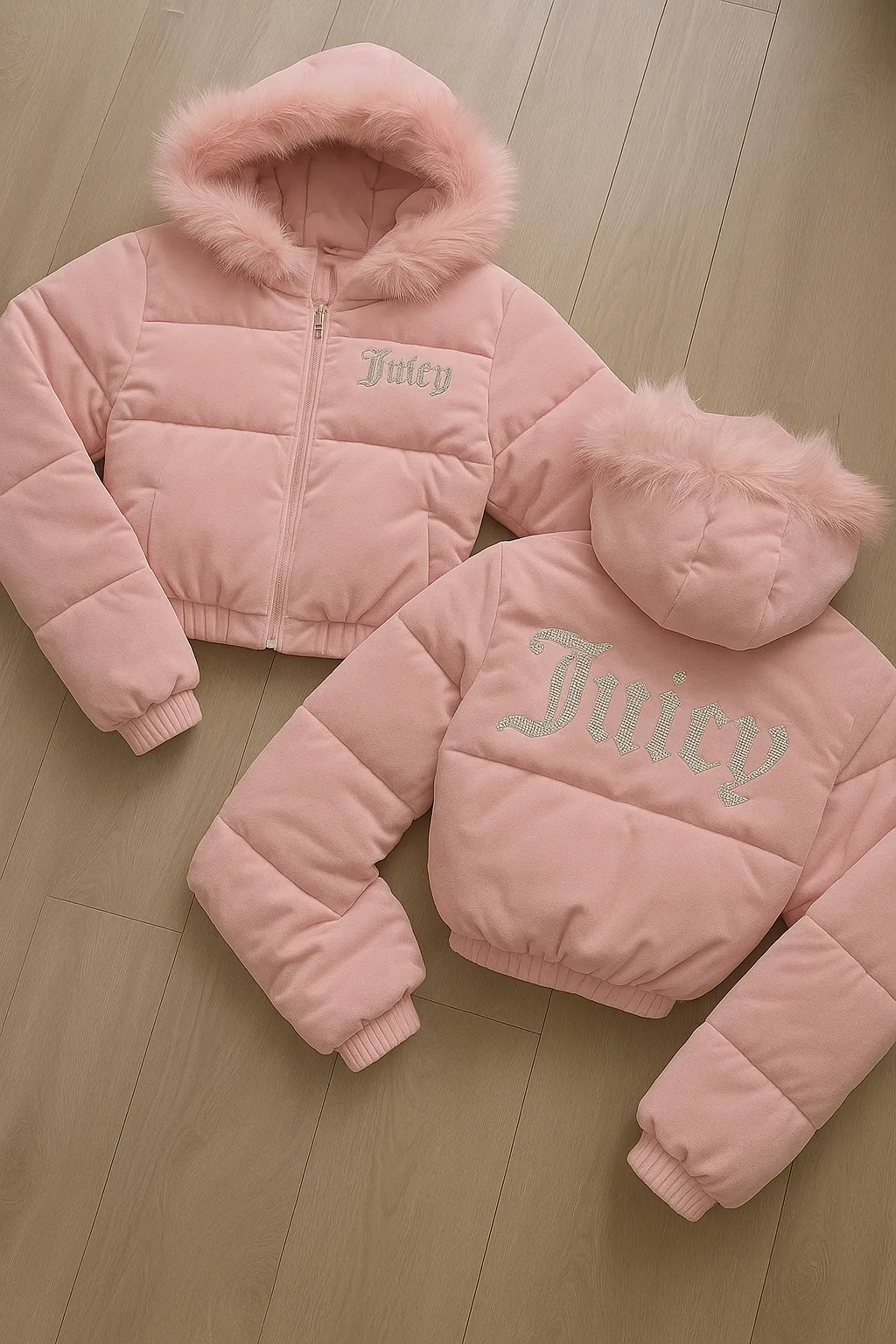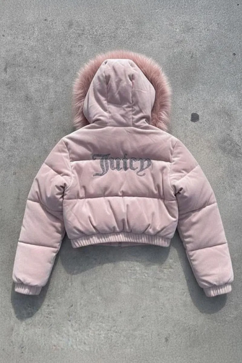 Pembe Juicy Peluş Kapüşonlu Şişme Crop Mont