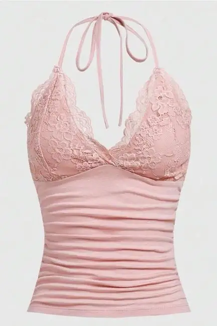 Pudra Dantelli V Yaka Gothic Boyun Bağlamalı Full Body Crop