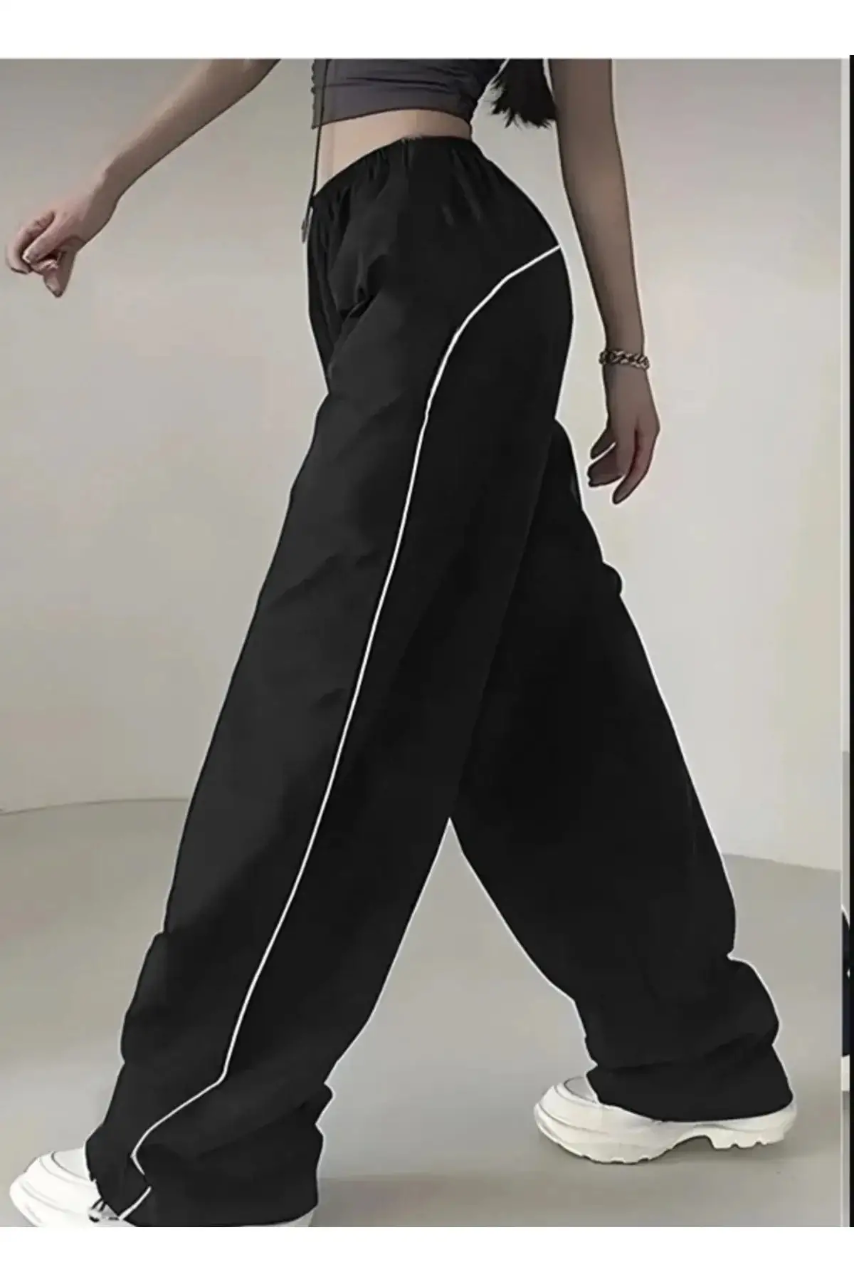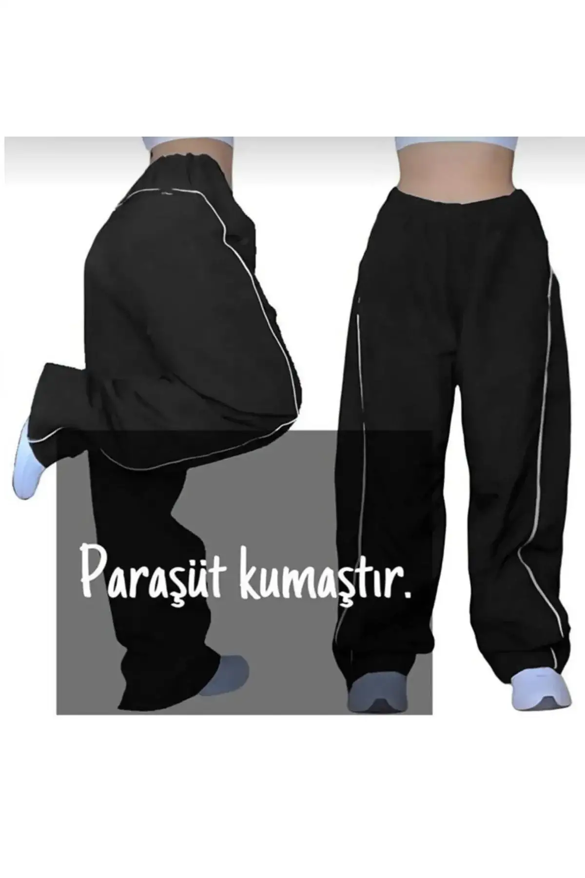SİYAH BELİ LASTİKLİ ŞERİTLİ PARAŞÜT BAGGY PANTOLON