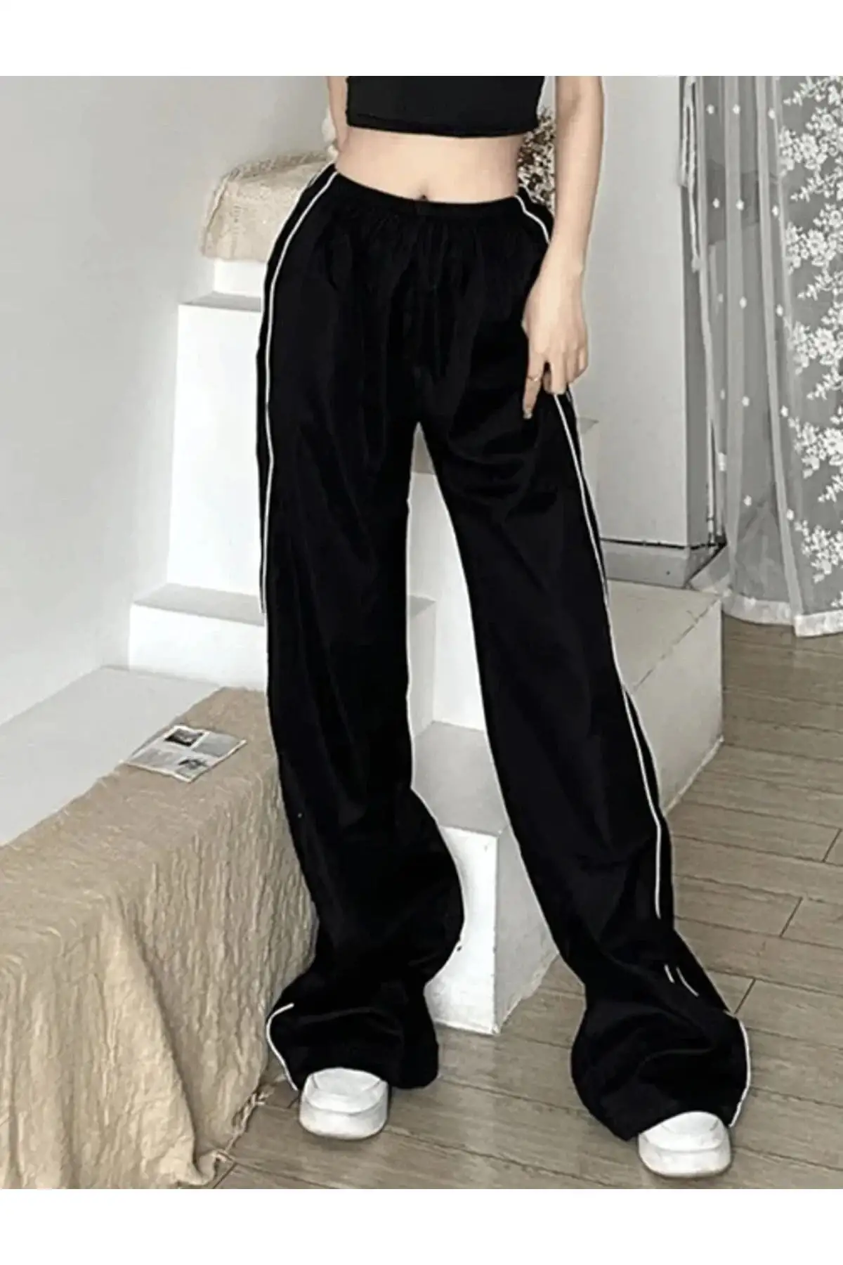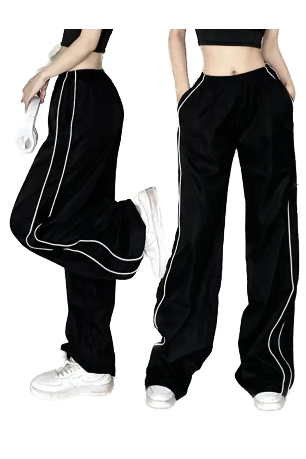 Siyah Beli Lastikli Şeritli Paraşüt Baggy Pantolon