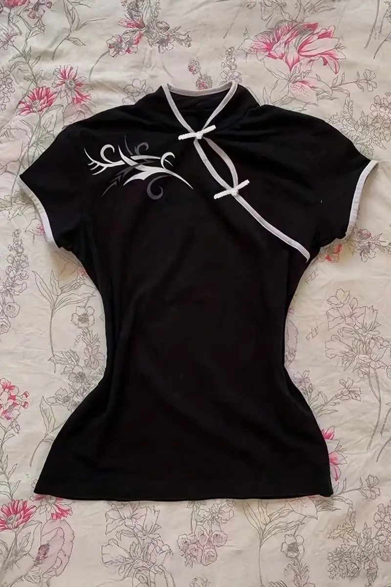 Siyah Çin Yakalı Floral Motifli Beyaz Şeritli Vintage Y2K Kısa Kollu Crop