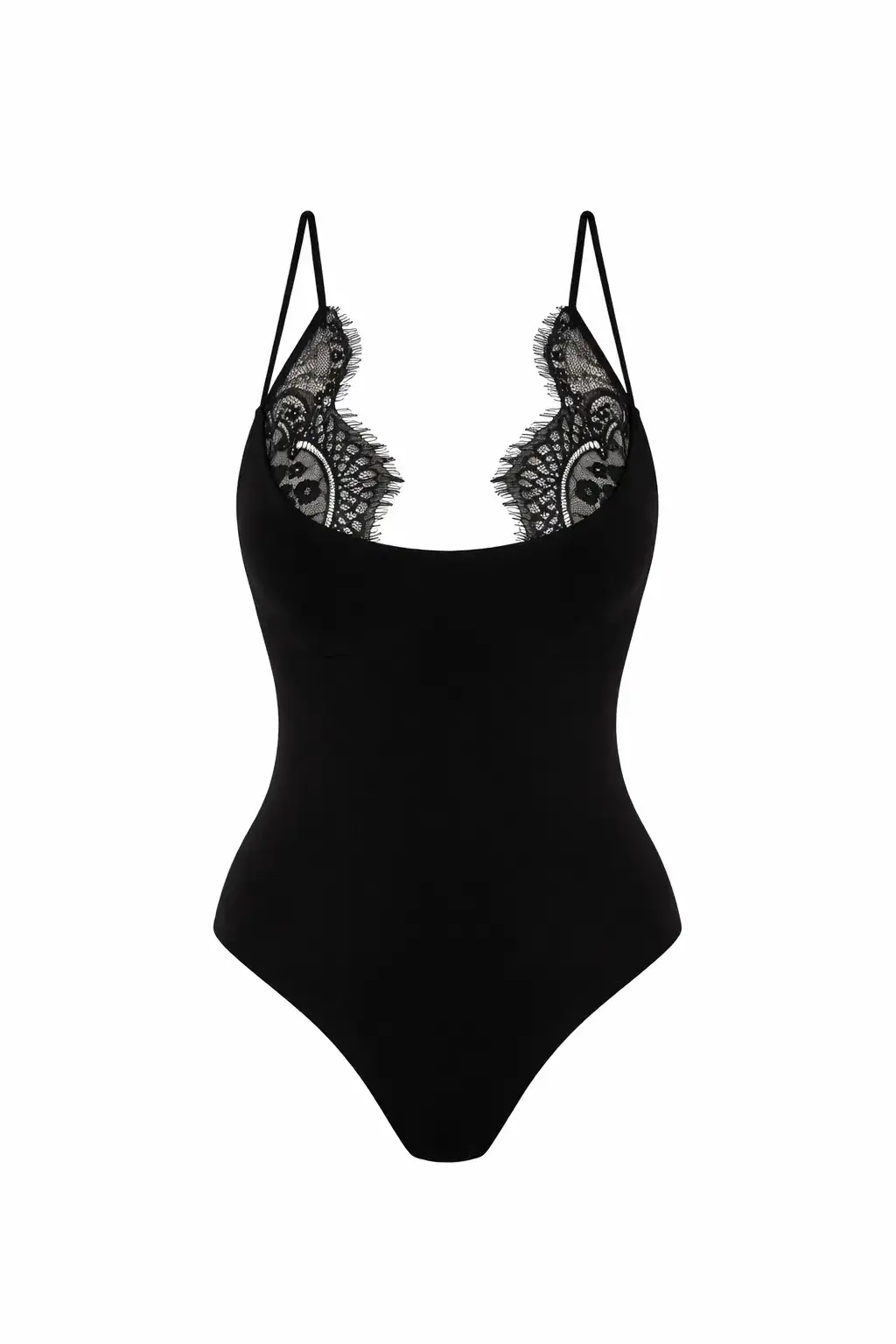 Kahverengi Dantel Detaylı Askılı Bodysuit