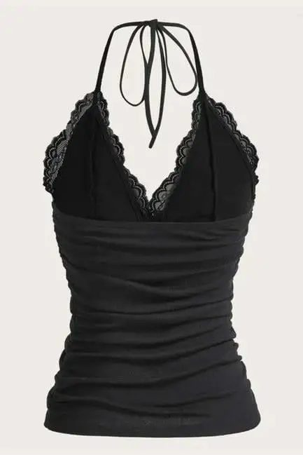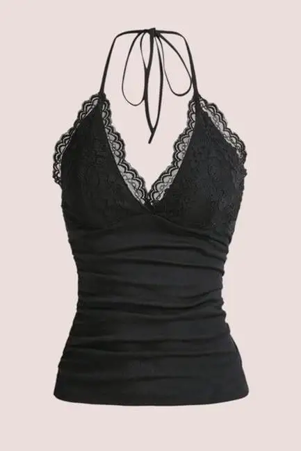 Siyah Dantelli V Yaka Gothic Boyun Bağlamalı Full Body Crop
