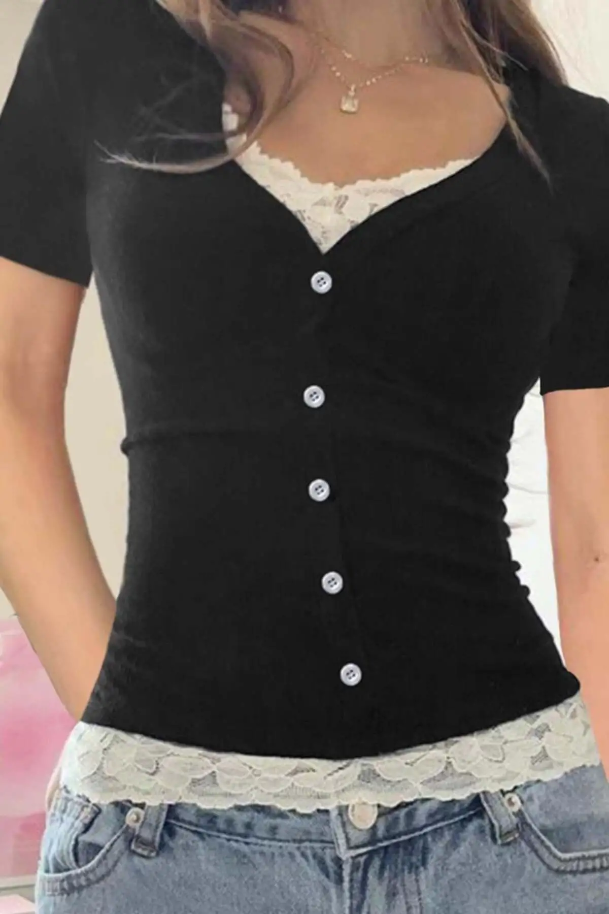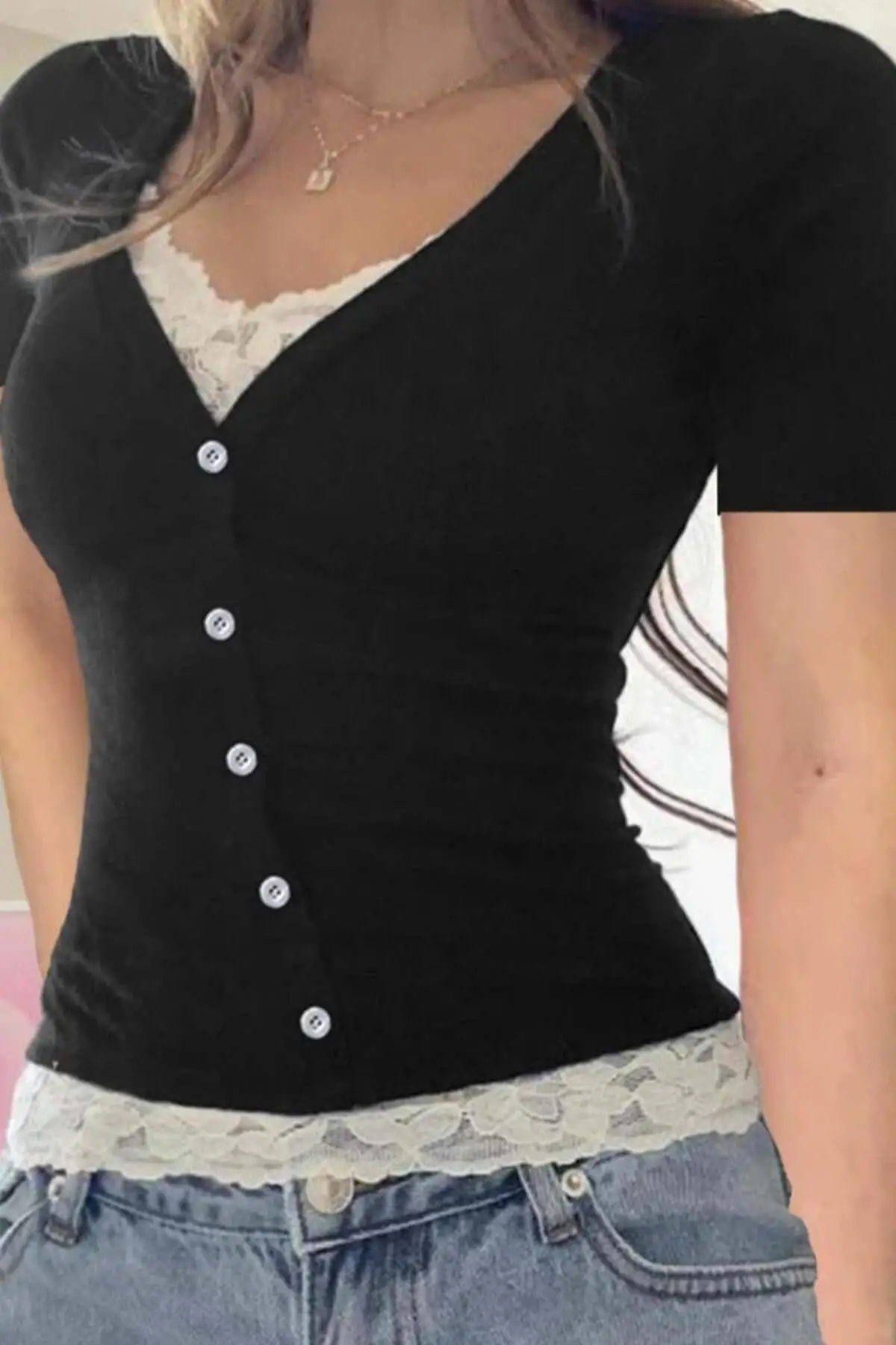 Siyah Düğmeli Dantel Yaka Ve Bel Detaylı Kısa Kollu Crop
