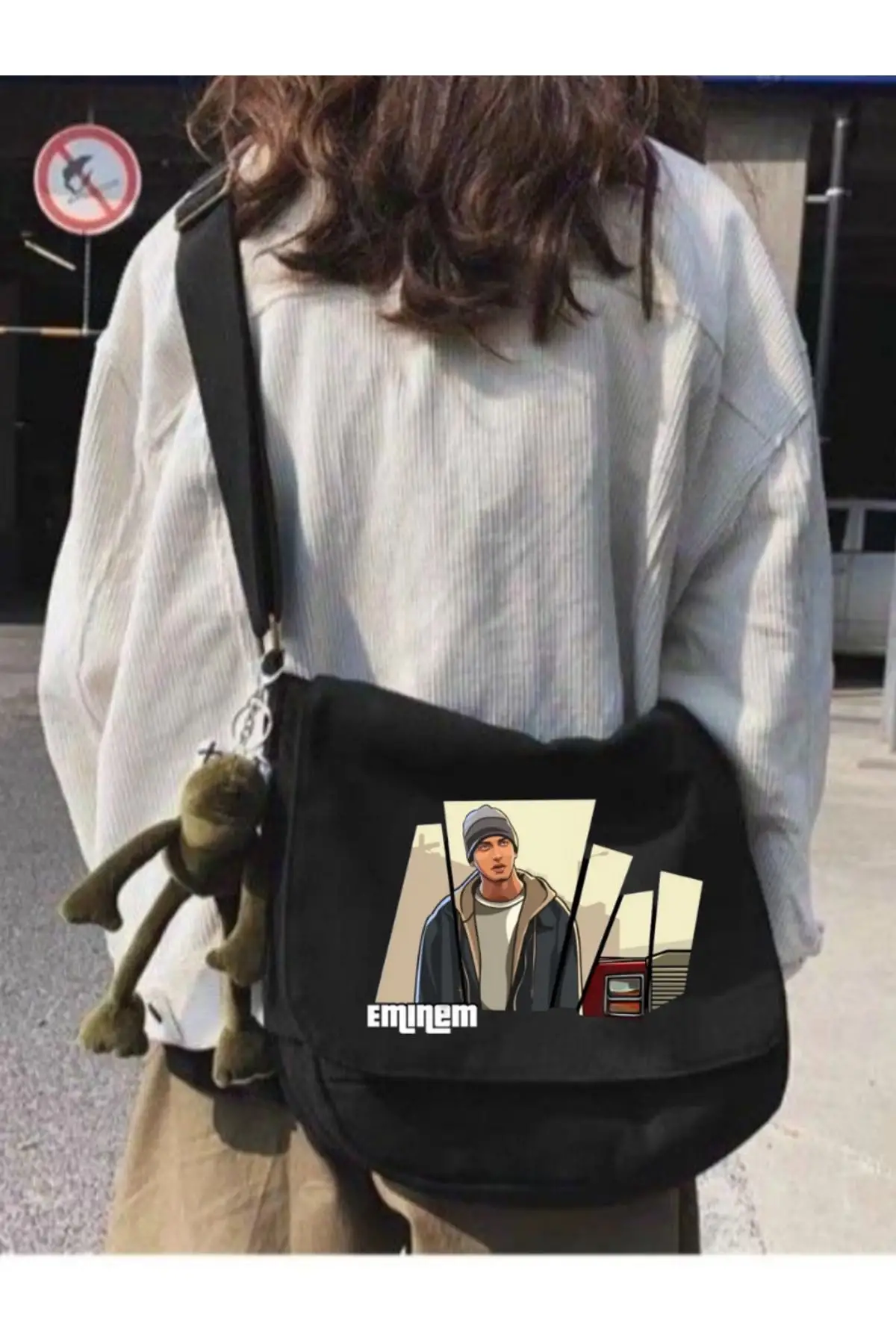 Siyah Eminem Baskılı Unisex Askılı Postacı Çanta