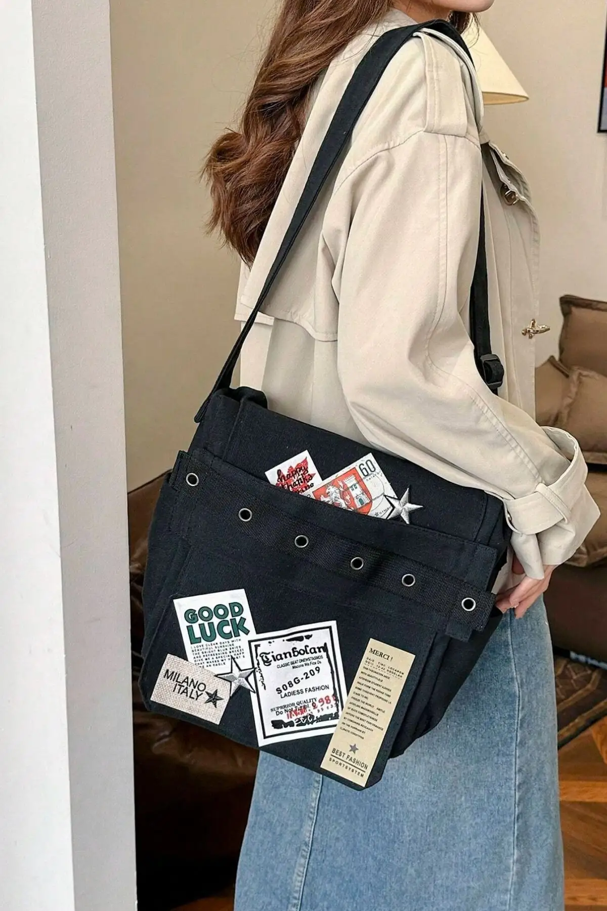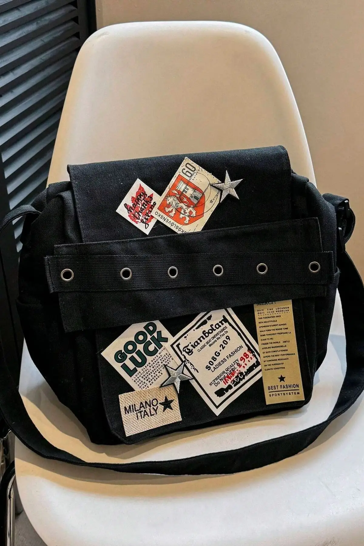 Siyah Good Luck Patch Baskılı Postacı Omuz Çantası