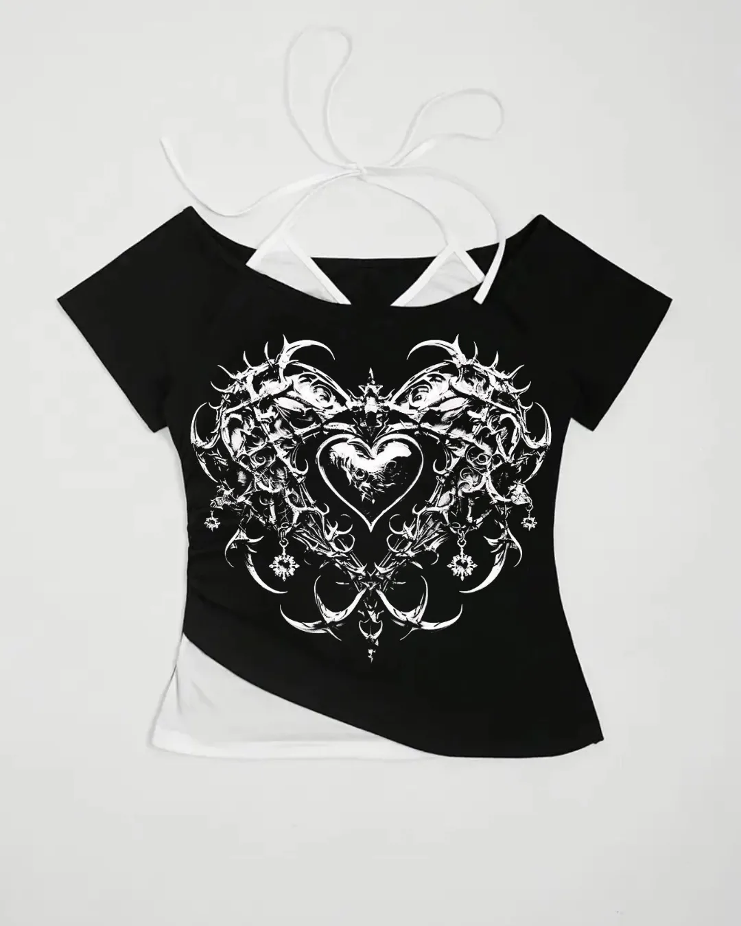 Siyah Gothic Love Yaka Ek Askılı Kısa Kollu Full Body Crop