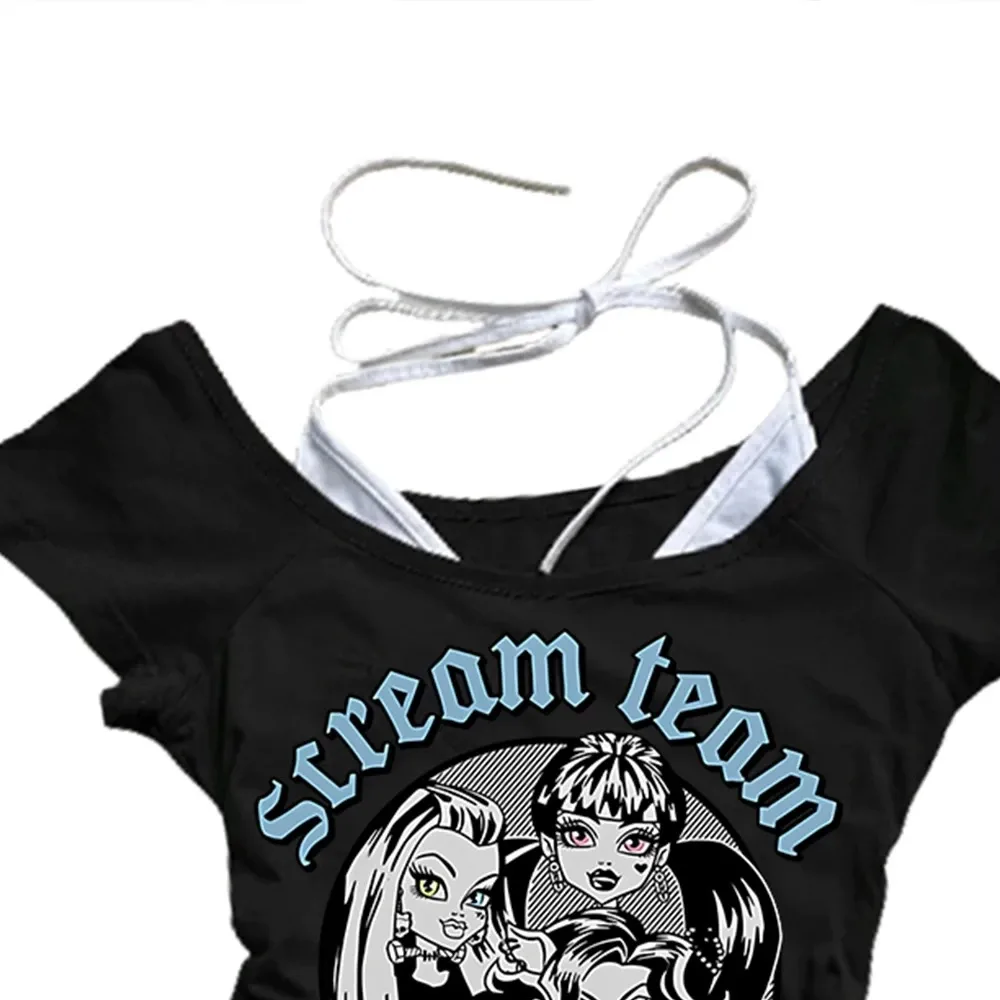 Siyah Gothic Scream Team Yaka Ek Askılı Kısa Kollu Full Body Crop