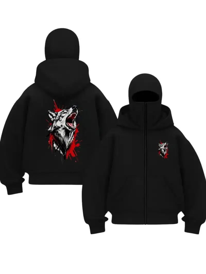 Siyah Howling Wolf Baskılı Kar Maskeli Unisex Sweatshirt Hırka